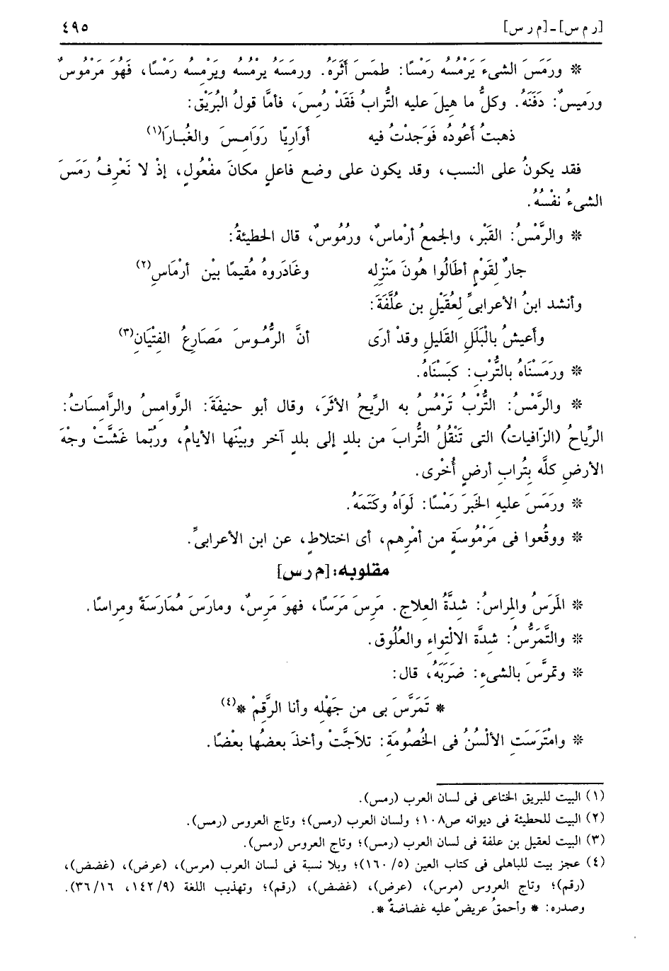 ورَمَسْنَاهُ بالتُّرْبِ كبَسْنَاهُ والرَّمْسُ التُّرْبُ تَرْمُسُ به الرِّيحُ الأثَرَ وقال أبو حنيفَةَ الرَّوامِسُ والرَّامسَاتُ الرِّياحُ الزّافياتُ التي تَنْقُلُ التُّرابَ من بلدٍ إلى بلدٍ آخر وبيْنَها الأيامُ ورُبّما غَشَّتْ وجْهَ الأرضِ كلَّه بِتُرابِ أرضٍ أُخْرى ورَمَسَ عليهِ الخَبَرَ رَمْساً لَوَاهُ وكَتَمَهُ ووقُعوا في مَرْمُوسَةٍ من أمْرِهم أي اختلاطٍ عن ابن الأعرابيِّ