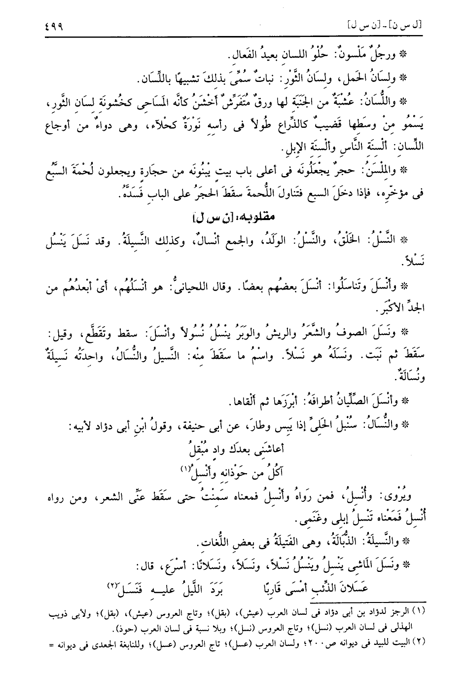 النَّسْلُ الخَلْقُ والنَّسْلُ الوَلَدُ والجمع أنْسالٌ وكذِلك النَّسِيلَةُ وقد نَسَلَ يَنْسُل نَسْلاً وأَنْسَلَ وتَناسَلُوا أنْسَلَ بعضُهم بعضاً وقال اللحيانيُّ هو أنْسَلُهُم أي أبْعدُهُم من الجدِّ الأكْبَر ونَسَلَ الصوفُ والشَّعَرُ والريشُ والوَبَرُ ينْسُلُ نُسُولاً وأنْسَلَ سقط وتَقَطَّع وقيل سَقَطَ ثم نَبَت ونَسَلَهُ هو نَسْلاً واسْمُ ما سَقَطَ مِنْه النَّسيلُ والنُّسَالُ واحِدَتُه نَسِيلَةٌ ونُسَالَةٌ وأنْسَلَ الصِّلِّيانُ أطرافهُ أبْرَزَها ثم أَلْقاها والنُّسَالُ سُنْبلُ الحَلِيِّ إذا يَبِس وطارَ عن أبي حنيفة وقولُ ابْنِ أبي دؤاد لأبيه