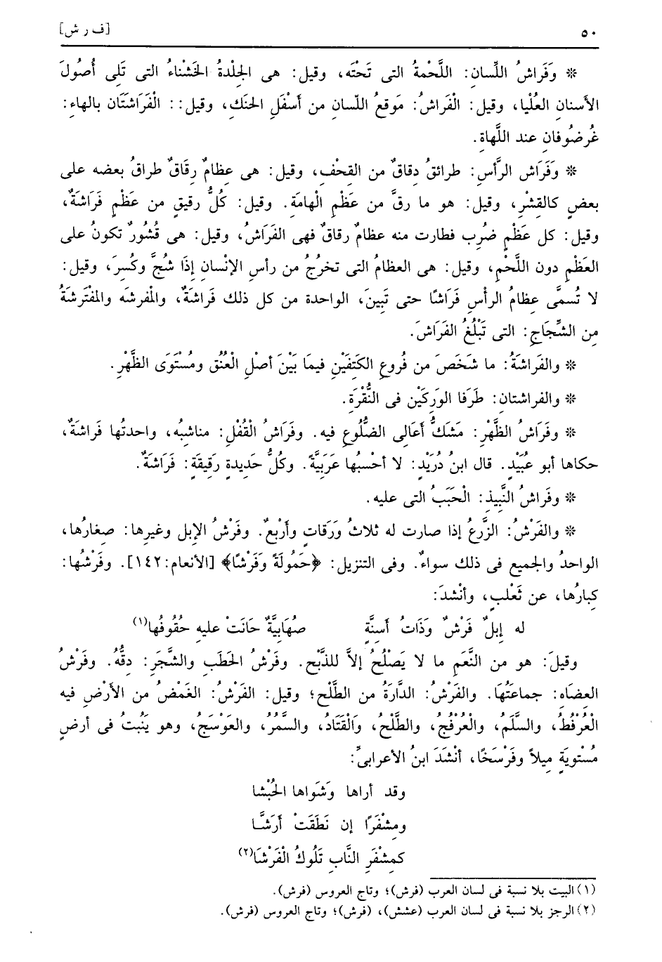 وفَرَاشُ اللِّسانِ اللَّحْمةُ التي تَحْتَه وقيل هي الجِلْدةُ الخَشْناءُ التي تَلِي أُصُولَ الأَسنانِ العُلْيا وقيل الْفَراشُ مَوقعُ اللّسانِ من أَسْفَلِ الحنَكِ وقيل الْفَرَاشَتَان بالهاءِ غُرضُوفانِ عند اللَّهاةِ وَفَرَاش الرَّأسِ طرائقُ دِقاقٌ من القِحْفِ وقيل هي عِظامٌ رِقَاقٌ طراقُ بعضه على بعضٍ كالقِشْرِ وقيل هو ما رقَّ من عَظْمِ الْهامَةِ وقيل كُلُّ رقيقٍ من عَظْمٍ فَرَاشَهٌ وقيل كل عَظْمٍ ضُرِب فطارت منه عظامٌ رقاقٌ فهيالفَرَاشُ وقيل هي قُشُورٌ تكونُ على العَظْمِ دون اللَّحْمِ وقيل هي العظامُ التي تخرُجُ من رأسِ الإنْسانِ إِذَا شُجَّ وكُسِرَ وقيل لا تُسمَّى عِظامُ الرأْسِ فَرَاشاً حتى تَبِينَ الواحدة من كل ذلك فَراشَةٌ والمْفرشَه والمفْتَرشَةُ مِن الشِّجَاجِ التي تَبْلُغُ الفَرَاشَ والفَرَاشَةُ ما شَخَصَ من فُروعِ الكَتِفَيْنِ فيمَا بَيْنَ أصْلِ الْعُنُق ومُسْتَوَى الظَّهْرِ والفراشتانِ طَرفَا الوَرِكَيْن في النُّقْرَةِ وفَرَاشُ الظَّهْرِ مَشَكُّ أَعَالِي الضُّلُوعِ فيه وفَرَاشُ القُفْلِ مناشِبُه واحدتُها فَراشَةٌ حكاها أبو عُبَيْد قال ابنُ دُرَيْدٍ لا أحْسبُها عَرَبِيَّةً وكُلُّ حَدِيدةٍ رَقِيقَةٍ فَرَاشَةٌ وفَراشُ النَّبِيذِ الْحَبَبُ التي عليه والفَرْشُ الزَّرعُ إذا صارت له ثلاثُ وَرَقاتٍ وأَرْبعٌ وقَرْشُ الإِبل وغيرِها صِغارُها الواحدُ والجميع في ذلك سواءٌ وفي التنزيل {حمولة وفرشا} الأنعام 142 وفَرْشُها كِبارُها عن ثَعْلبٍ وأنْشدَ