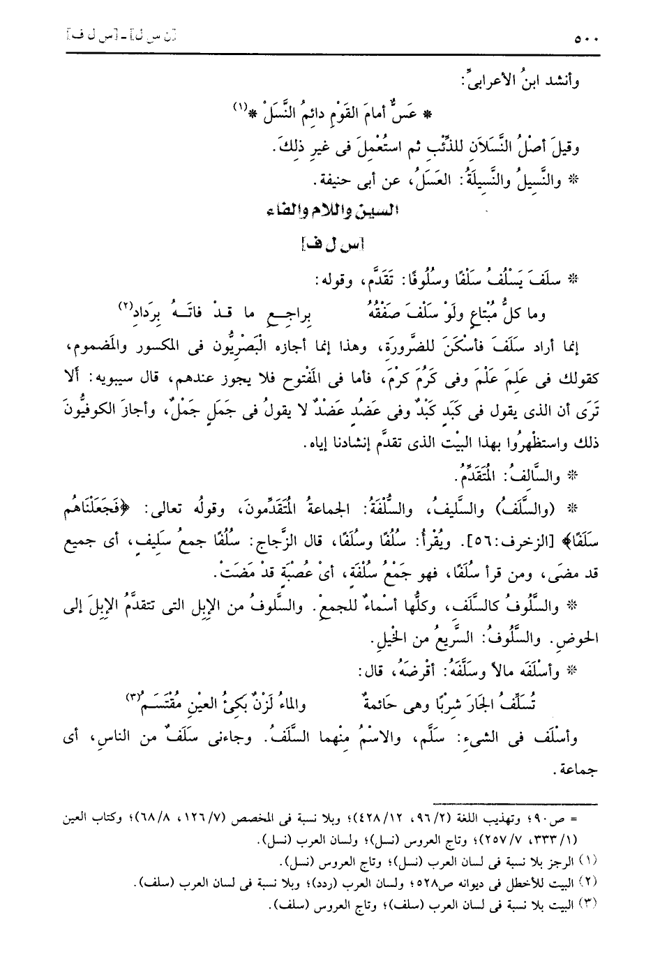 إنما أراد سَلَفَ فأسْكَنَ للضَّرورَةِ وهذا إنما أجازه الْبَصْرِيُّون في المكسور والمَضموم كقولك في عَلِمَ عَلْمَ وفي كَرُمَ كرْمَ فأما في المَفْتوح فلا يجوز عندهم قال سيبويه أَلا تَرَى أن الذي يقول في كَبَدٍ كَبْدٌ وفي عَضُدٍ عَضْدٌ لا يقولُ في جَمَلٍ جَمْلٌ وأجازَ الكوفُّيونَ ذلك واستظْهرُوا بهذا البيْت الذي تقدَّم إنشادنا إياه والسَّالِفُ المُتَقَدِّمُ والسَّلَفُ والسَّليفُ والسُّلْفَةُ الجماعةُ المُتَقدِّمونَ وقولُه تعالى {فجعلناهم سلفا} الزخرف 56 ويُقْرأُ سُلُفاً وسُلَفاً قال الزَّجاج سُلُفاً جمعُ سَلِيفٍ أي جميع قد مضَى ومن قرأ سُلَفاً فهو جَمْعُ سُلْفَةٍ أيْ عُصْبَة قدْ مَضَتْ والسَّلُوفُ كالسَّلَف وكلُّها أسْماءٌ للجمعِ والسَّلوفُ من الإِبِل التي تتقدَّمُ الإِبِل إلى الحوضِ والسَّلُوفُ السَّريعُ من الخيْلِ وأسْلَفَه مالاً وسَلَّفَهُ أقْرضَهُ قال