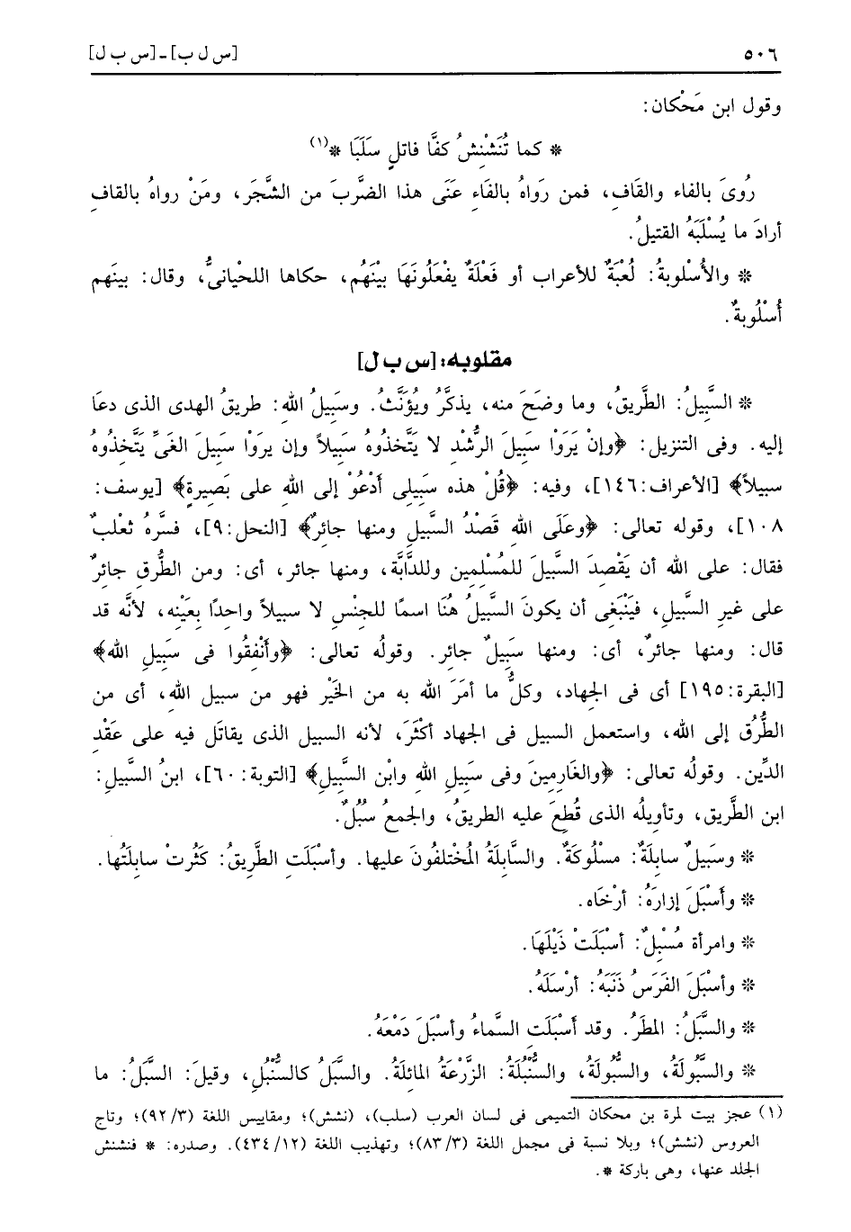 السَّبِيلُ الطَّريقُ وما وضَحَ منه يذكَّرُ ويُؤَنَّثُ وسَبِيلُ اللهِ طريقُ الهدى الذي دعَا إليه وفي التنزيل {وإن يروا سبيل الرشد لا يتخذوه سبيلا وإن يروا سبيل الغي يتخذوه سبيلا} الأعراف 146 وفيه {قل هذه سبيلي أدعو إلى الله على بصيرة} يوسف 108 وقوله تعالى {وعلى الله قصد السبيل ومنها جائر} النحل 9 فسَّرهُ ثعْلبٌ فقال على الله أن يَقْصِدَ السَّبيلَ للمُسْلِمِين وللدَّابَّة ومنها جائر أي ومن الطُّرقِ جائِرٌ على غيرِ السَّبيلِ فيَنْبَغِي أن يكونَ السَّبيلُ هُنَا اسماً للجنْسِ لا سبيلاً واحِداً بِعَيْنِه لأنَّه قد قال ومنها جائرٌ أي ومنها سَبِيلٌ جائِر وقولُه تعالى {وأنفقوا في سبيل الله} البقرة 195 أي في الجِهاد وكلُّ ما أمَرَ الله به من الخَيْر فهو من سبيل اللهِ أي من الطُّرُق إلى الله واستعمل السبيل في الجهاد أكْثَرَ لأنه السبيل الذي يقاتَل فيه على عَقْدِ الدِّين وقولُه تعالى {والغارمين وفي سبيل الله وابن السبيل} التوبة 60 ابنُ السَّبيلِ ابن الطَّريق وتأويلُه الذي قُطِعَ عليه الطريقُ والجمعُ سُبُلٌ وسَبيلٌ سابِلَةٌ مسْلُوكَةٌ والسَّابِلَةُ المُخْتلفُونَ عليها وأسْبَلَتِ الطَّرِيقُ كَثُرت سابِلَتُها وأسْبَلَ إزارَهُ أرْخَاه وامرأة مُسْبِلٌ أسْبَلَتْ ذَيْلَهَا وأسْبَلَ الفَرَسُ ذَنَبَهُ أرْسَلهُ والسَّبَلُ المطَرُ وقد أَسْبَلَتِ السَّماءُ وأسْبَلَ دَمْعَهُ والسَّبُولَةُ والسُّبُولَةُ والسُّنْبُلَةُ الزَّرْعَةُ المائِلَةُ والسَّبَلُ كالسُّنْبُلِ وقيلَ السَّبَلُ ما