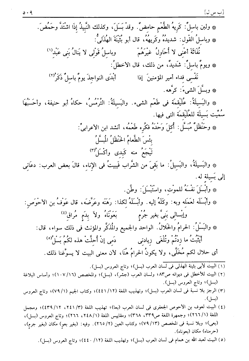 ولبن باسِلٌ كَرِيهُ الطَّعْمِ حامِضٌ وقدْ بَسَلَ وكذلك النَّبِيذُ إِذَا اشْتَدَّ وحَمُضَ وباسِلُ القْولِ شديدُهُ وكَريهُهُ قال أبو بُثَيْنَةَ الهُذَليُّ