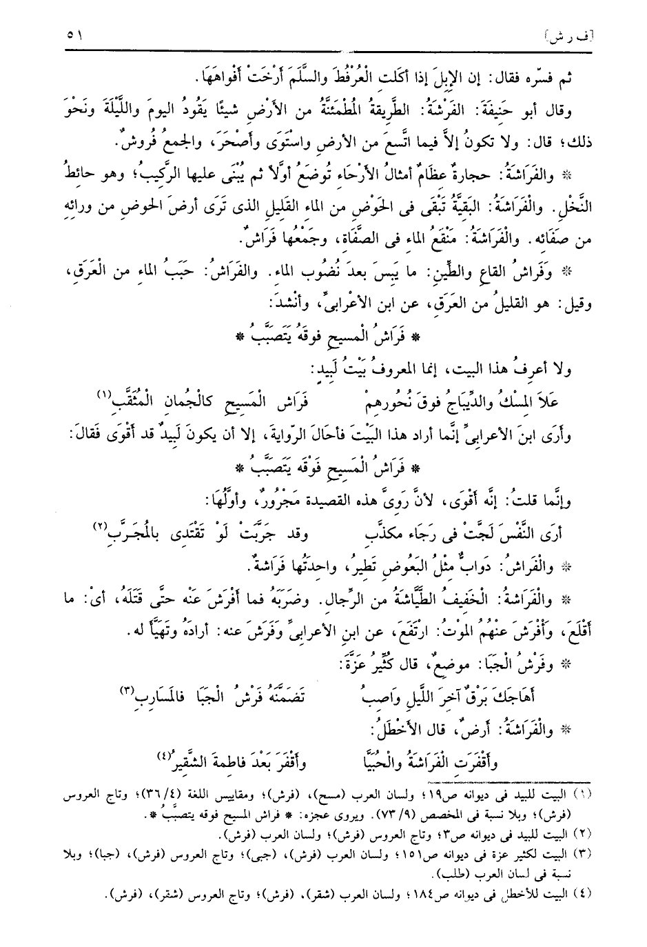 ثم فسّره فقال إن الإِبِلَ إذا أكَلتِ العُرْفُطَ والسَّلَمَ أَرْخَتْ أَفْواهَهَا وقال أبو حَنِيفَةَ الفَرْشَةُ الطَّرِيقةُ المُطْمَئنَّةُ من الأَرْضِ شيئاً يَقُودُ اليومَ واللَّيْلَةَ ونَحْوَ ذلك قال ولا تكونُ إلاَّ فيما اتَّسعَ من الأرضِ واْسْتَوَى وأَصْحَرَ والجمعُ فُروشٌ والفَرَاشَةُ حجارةٌ عِظَامٌ أمثالُ الأَرْحَاءِ تُوْضَعُ أوَّلاً ثم يُبْنَى عليها الرَّكِيبُ وهو حائِطُ النَّخْلِ والفَرَاشَةُ البَقِيَّةُ تَبْقَى في الحَوْضِ من الماءِ القَلِيلِ الذي تَرَى أرضَ الحوضِ من ورائِهِ من صَفَائِه والْفَرَاشَةُ مَنْقَعُ الماءِ في الصَّفَاةِ وجَمْعُها فَرَاشٌ وَفَراشُ القاعِ والطِّينِ ما يَبِسَ بعدَ نُضُوب الماءِ والفَرَاشُ حَبَبُ الماءِ من الْعَرَقِ وقيل هو القليلُ من العَرَقِ عن ابن الأعرابيِّ وأنْشد