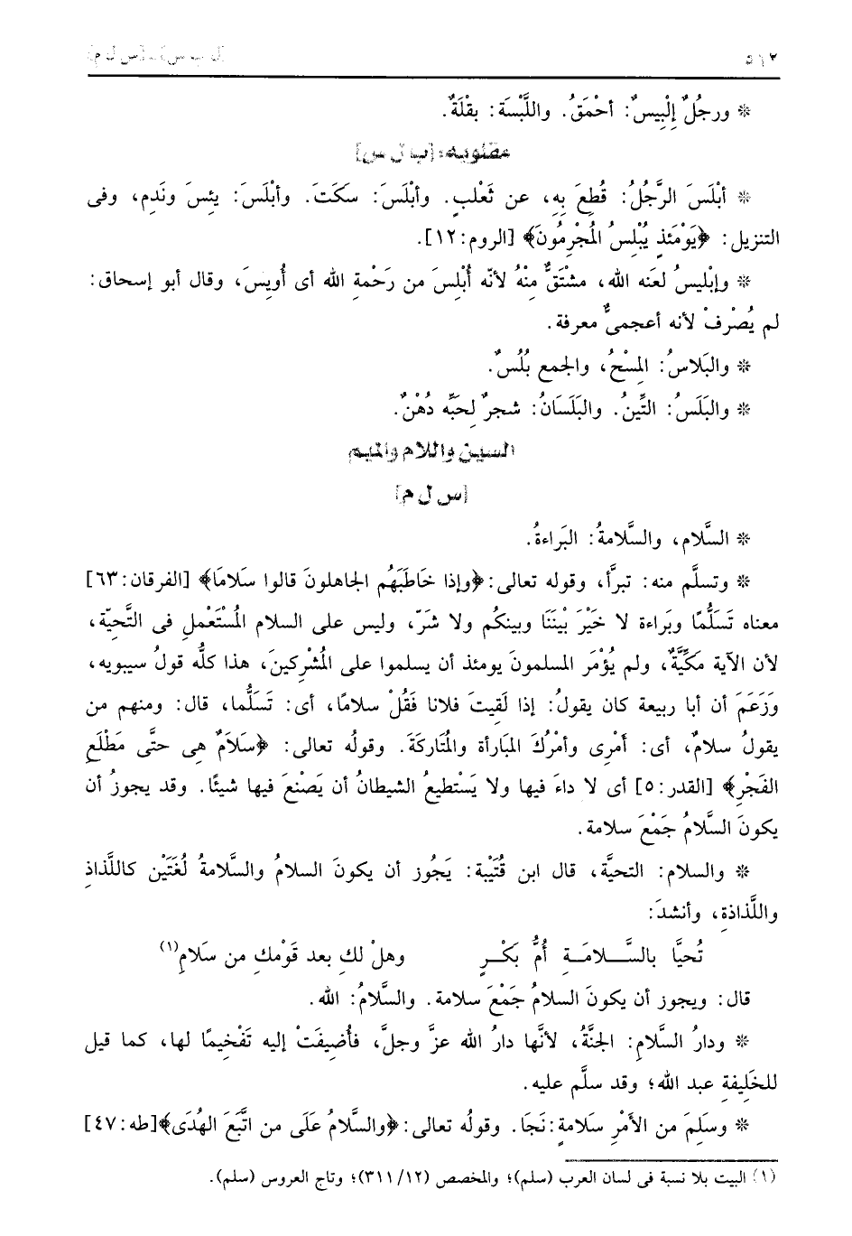 السَّلام والسَّلامةُ البَراءةُ وتسلَّم منه تبرَّأ وقوله تعالى {وإذا خاطبهم الجاهلون قالوا سلاما} الفرقان 63 معناه تَسَلُّماً وبَراءة لا خَيْرَ بَيْنَنَا وبينكُم ولا شَرّ وليس على السلام المُسْتَعْمَلِ في التَّحِيّة لأن الآية مَكِّيَّةٌ ولم يُؤْمَر المسلمونَ يومئذ أن يسلموا على المُشْرِكينَ هذا كلُّه قولُ سيبويه وزَعَمَ أن أبا ربيعة كان يقولُ إذا لَقِيتَ فلانا فَقُلْ سلاماً أي تَسَلُّما قال ومنهم من يقولُ سلامٌ أي أَمْرِي وأمْرُكَ المَبارأة والمُتَاركَةَ وقولُه تعالى {سلام هي حتى مطلع الفجر} القدر 5 أي لا داءَ فيها ولا يَسْتطيعُ الشيطانُ أن يَصْنعَ فيها شيئاً وقد يجوزُ أن يكونَ السَّلامُ جَمْعَ سلامة والسلام التحيَّة قال ابن قُتَيْبة يَجُوز أن يكونَ السلامُ والسَّلامةُ لُغَتَيْن كاللَّذاذِ واللَّذاذةِ وأنشد