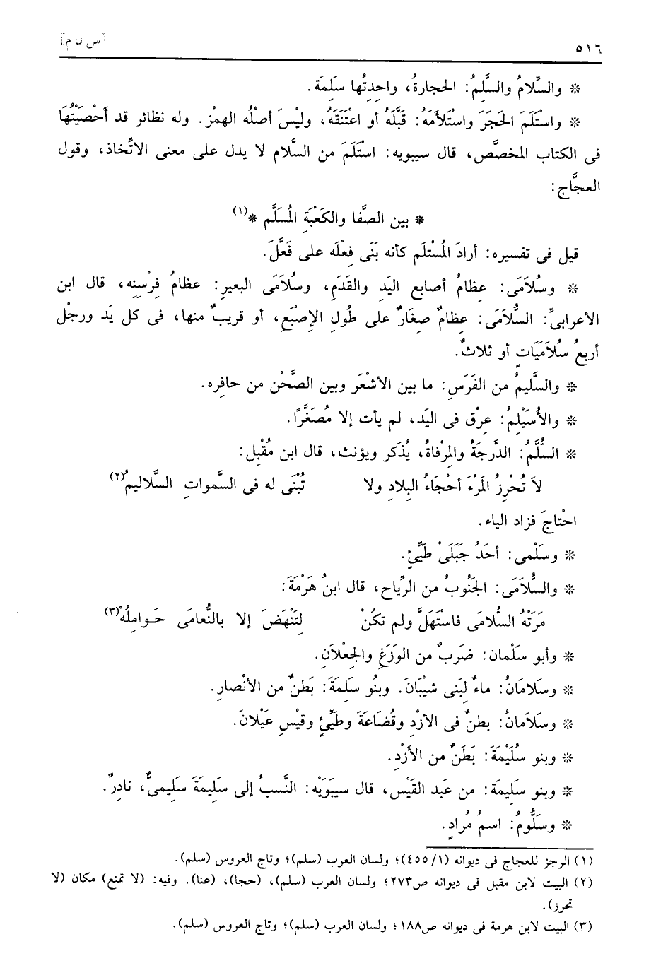 والسِّلامُ والسَّلِمُ الحجارةُ واحِدِتُها سَلِمَة واسْتَلَمَ الحَجَرَ واسْتَلأَمَهُ قَبَّلَهُ أو اعْتَنَقَهُ وليْسَ أصْلُه الهمْز وله نظائر قد أَحْصَيْتُهَا في الكتاب المخصَّص قال سيبويه اسْتَلَمَ من السَّلام لا يدل على معنى الاتِّخاذ وقول العجَّاج