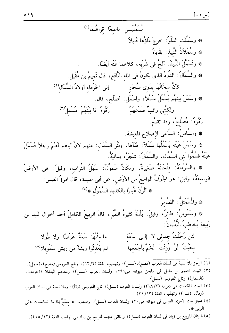 وسَمَّلَتِ الدَّلْوُ خرجَ مَاؤُها قَليلاً وسُمْلاَنُ النَّبِيذ بقَاياهُ وتَسَمَّلَ النَّبيذَ ألحَّ في شُرْبِه كلاهما عَنْه أيْضاً والسَّمَالُ الدُّودُ الذي يكونُ في الماءِ النَّاقِع قال تَمِيمُ بن مُقْبل