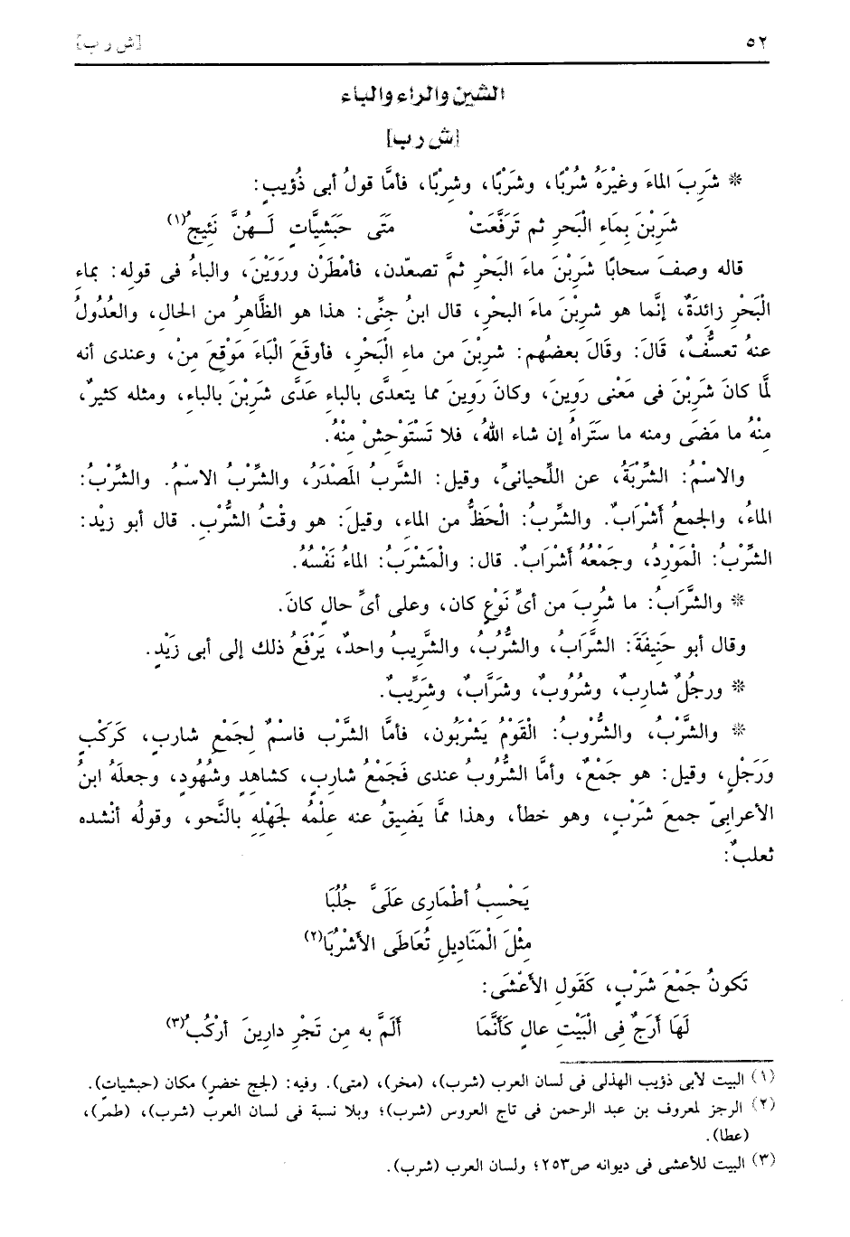 قاله وصفَ سحابًا شَرِبْنَ ماءَ البَحْرِ ثمَّ تصعدّن فأمْطَرْن ورَوَيْنَ والباءُ في قولِه بماءِ الْبَحْرِ زائِدَةٌ إنَّما هو شرِبْنَ ماءَ البحْرِ قال ابنُ جِنِّي هذا هو الظَّاهِرُ من الحالِ والعُدُولُ عنهُ تعسُّفٌ قَالَ وقَالَ بعضُهم شرِبْنَ من ماءِ البَحْرِ فأوقَعَ الْبَاءِ مَوْقِعَ مِنْ وعندي أنه لمَّا كانَ شَرِبْنَ في مَعْنى رَوِينَ وكانَ رَوِينَ مما يتعدَّى بالباءِ عَدَّى شَرِبْنَ بالباءِ ومثله كثيرٌ مِنْهُ ما مَضَى ومنه ما سَتَراهُ إن شاء اللهُ فلا تَسْتَوْحِشْ مِنْهُ والاسْمُ الشِّرْبَةُ عن اللِّحيانيِّ وقيل الشَّربُ المَصْدَرُ والشِّرْبُ الاسْمُ والشِّرْبُ الماءُ والجمعُ أَشْرَابٌ والشِّرْبُ الحَظُّ من الماءِ وقيلَ هو وقْتُ الشُّرْب قال أبو زيْد الشِّرْبُ المَوْرِدُ وجَمْعُهُ أَشْرَابٌ قال والمَشْرَبُ الماءُ نَفْسُهُ والشَّرَابُ ما شُرِبَ من أيِّ نَوْعٍ كان وعلى أيِّ حالٍ كانَ وقال أبو حَنِيفَةَ الشَّرَابُ والشُّرُبُ والشَّرِيبُ واحدٌ يَرْفَعُ ذلك إلى أبي زَيْدٍ ورجُلٌ شارِبٌ وشُرُوبٌ وشَرَّابٌ وشَرِيبٌ والشَّرْبُ والشُّرْوبُ القَوْمُ يَشْرَبُون فأمَّا الشَّرْب فاسْمٌ لِجَمْعِ شاربٍ كَرَكْبٍ وَرَجْلٍ وقيل هو جَمْعٌ وأمَّا الشُّرُوبُ عندي فَجَمْعُ شارِبٍ كشاهِدٍ وشُهُودٍ وجعلَهُ ابنُ الأعرابِيِّ جمعَ شَرْبٍ وهو خطأ وهذا ممَّا يَضِيقُ عنه عِلْمُهُ لجَهْلِهِ بالنَّحو وقولهُ أنْشده ثعلبٌ