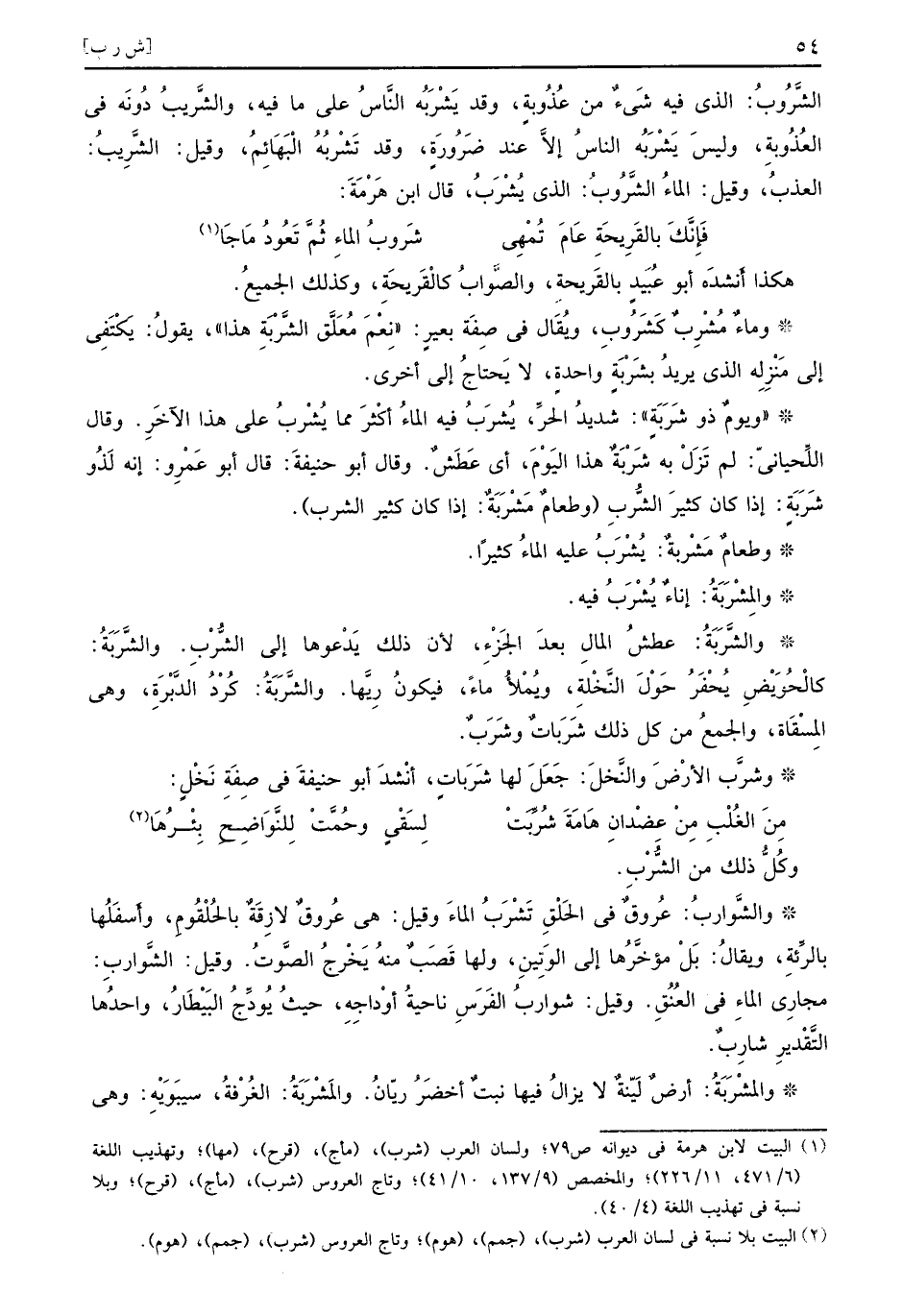 هكذا أنشدَه أبو عُبَيدٍ بالقَريحةِ والصَّوابُ كالْقَريحَةِ وكذلك الجميعُ وماءٌ مُشْرِبٌ كَشَرُوبِ ويُقَال في صِفَة بعيرٍ نِعْمَ مُعَلَّق الشَّرْبَةِ هذا يقولُ يَكْتَفِي إلى مَنْزِلِه الذي يريدُ بشَرْبَةٍ واحدةٍ لا يَحتاجُ إلى أخرى ويومٌ ذو شَرَبَةٍ شديدُ الحرِّ يُشْرَبُ فيه الماءُ أكْثرَ مما يُشْرَبُ على هذا الآخَرِ وقال اللِّحيانيّ لم تَزَل به شَرْبَةٌ هذا اليَوْمَ أي عَطَشٌ وقال أبو حنيفةَ قال أبو عَمْرِو إنه لَذُو شَرَبَةٍ إذا كان كثيرَ الشُّربِ وطعامٌ مَشْرَبَةٌ إذا كان كثير الشرب وطعامٌ مَشْرَبةٌ يُشْرَبُ عليه الماءُ كثيراً والمِشْرَبَةُ إناءٌ يُشْرَبُ فيه والشَّرَبَةُ عطشُ المالِ بعدَ الجَزْءِ لأن ذلك يَدْعوها إلى الشُّرْبِ والشَّرَبَةُ كالْحُوَيْضِ يُحْفَزُ حَوْلَ النَّخْلةِ ويُمْلأُ ماءً فيكونُ رِيَّها والشَّرَبَةُ كُرْدُ الدَّبْرَةِ وهي المِسْقَاة والجمعُ من كل ذلك شَرَباتٌ وشَرَبٌ وشرَّب الأرْضَ والنَّخلَ جَعَلَ لها شَرَباتٍ أنْشدَ أبو حنيفةَ في صِفَةِ نَخْلٍ