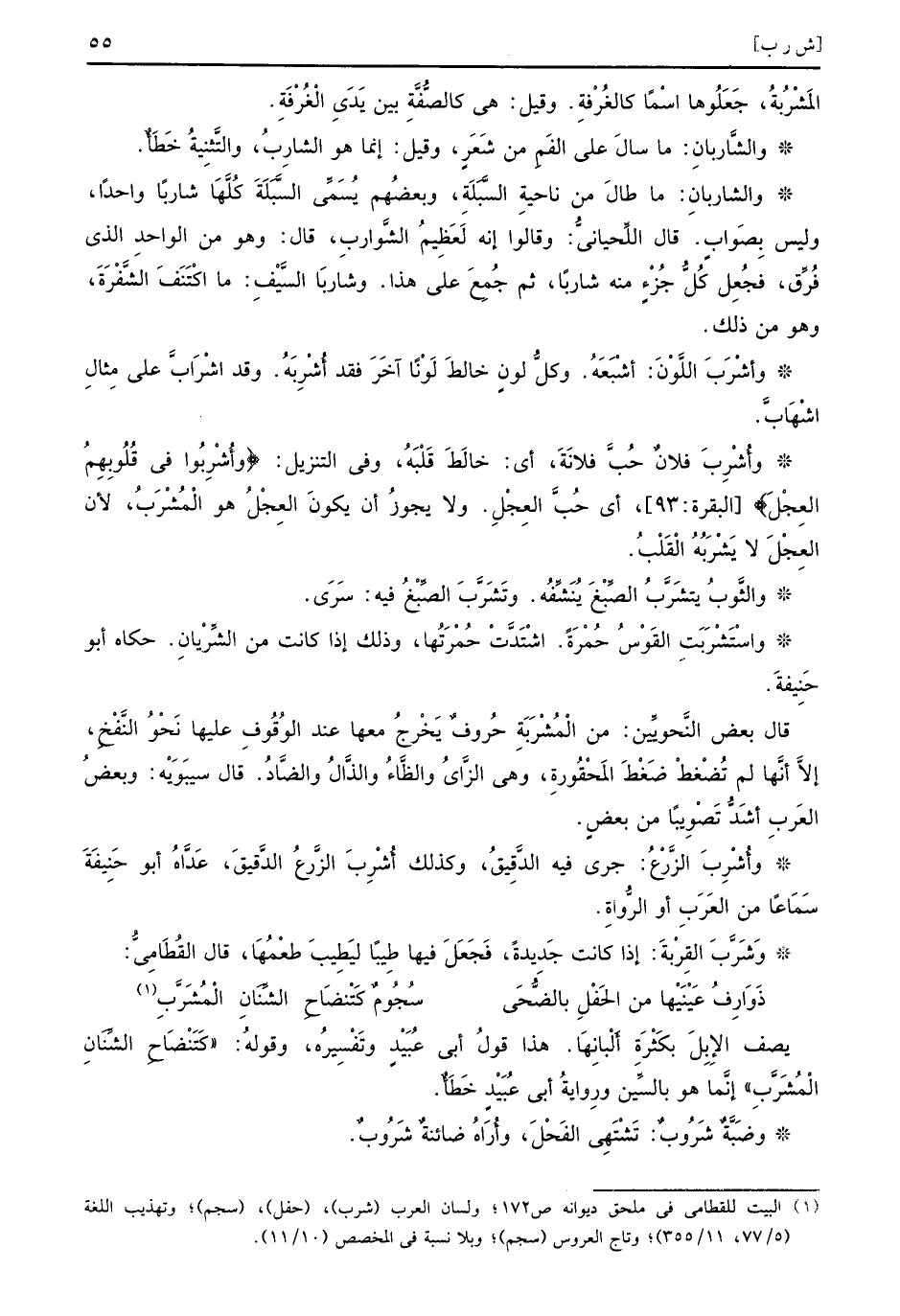 المَشْرُبةُ جَعَلُوها اسماً كالغُرفةِ وقيل هي كالصُّفَّةِ بين يَدَيِ الْغُرْفَةِ والشَّاربانِ ما سالَ على الفَمِ من شَعَرٍ وقيل إنما هو الشارِبُ والتَّثنِيةُ خَطَأٌ والشاربانِ ما طالَ من ناحيةِ السَّبَلَةِ وبعضُهم يُسَمَّى السَّبَلَةَ كُلَّهَا شاربًا واحداً وليس بِصَوابٍ قال اللِّحيانيِّ وقالوا إنه لَعَظِيمُ الشَّواربِ قال وهو من الواحدِ الذي فُرِّق فجُعِل كُلُّ جُزْءٍ منه شاربًا ثم جُمِعَ على هذا وشاربَا السَّيْفِ ما اكْتَنَفَ الشَّفْرَةَ وهو من ذلك وأشْرَبَ اللَّوْنَ أشْبَعَهُ وكلُّ لونٍ خالطَ لَوْنًا آخَرَ فقد أُشْرِبَهُ وقد اشْرَابَّ على مِثالِ اشْهَابَّ وأُشْرِبَ فلانٌ حُبَّ فلانَةَ أي خالَطَ قَلْبَهُ وفي التنزيل {وأشربوا في قلوبهم العجل} البقرة 93 أي حُبَّ العِجْلِ ولا يجوزُ أن يكونَ العِجْلُ هو الْمُشْرَبُ لأن العِجْلَ لا يَشْرَبُهُ الْقَلْبُ والثَّوْبُ يتشَرَّبُ الصِّبْغَ يُنَشِّفُه وتَشَرَّبَ الصِّبْغُ فيه سَرَى واسْتَشْرَبَتْ القَوْسُ حُمْرَةً اشْتَدَّتْ حُمْرَتُها وذلك إذا كانت من الشِّرْيانِ حكاه أبو حَنِيفَةَ قال بعض النَّحويِّين من المُشْرَبَةِ حُروفٌ يَخْرجُ معها عند الوُقُوفِ عليها نَحْوَ النَّفْخِ إلاَّ أنَّها لم تُضْغطْ ضَغْطَ المَحْقُورةِ وهي الزَّايُ والظَّاءُ والذَّالُ والضَّادُ قال سيبَوَيْه وبعضُ العَربِ أشَدُّ تَصْوِيبًا من بعضٍ وأُشْرِبَ الزَّرْعُ جرى فيه الدَّقِيقُ وكذلك أُشْرِبَ الزَّرْعُ الدَّقيقُ عَدَّاهُ أبو حَنِيفَةَ سَمَاعًا من العَرَبِ أو الرُّواةِ وشَرَّبَ القِرْبةَ إذا كانت جَدِيدةً فَجَعَلَ فيها طِيبًا ليَطِيبَ طعْمُهَا قال القُطَامِيُّ