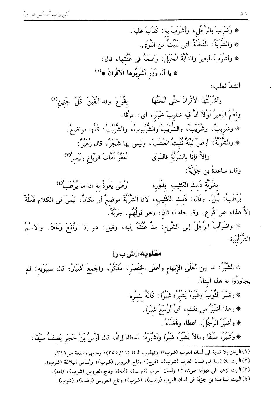 وَشَرِبَ بالرَّجُلِ وأَشْرَبَ بِهِ كَذَبَ عليه والشَّرْبَةُ النَّخْلَةُ التي تَنْبُتُ من النَّوَى وأشْرَبَ البعيرَ والدَّابَّةَ الْحَبْلَ وَضَعَهُ في عُنُقِها قال