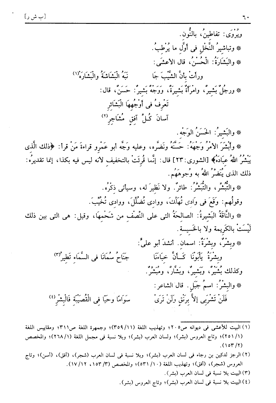 والبَشِيرُ الحَسَنُ الوَجْهِ وأَبْشَرَ الأمْرُ وَجْهَهُ حَسَّنَهُ ونَضَّره وعليه وَجَّه أبو عَمْرِو قراءةَ مَنْ قرأ {ذلك الذي يبشر الله عباده} الشورى 23 قال إنَّما قُرِئَتْ بالتخفيفِ لأنه ليس فيه بكذا إنما تقديرُه ذلك الذي يُنَضِّرُ اللهُ به وُجوهَهُم والتُّبُشِّر والتُّبَشِّرُ طائرٌ ولا نَظِيرَ له وسيأتي ذِكْرُه وقولُهم وَقَعَ في وَادِي تُهَلِّكَ ووادِي تُضُلِّلَ ووادِي تُخُيِّبَ والنَّاقَةُ البَشِيرةُ الصالِحَةُ التي على النِّصْفِ من شَحْمِهَا وقيل هي التي بين ذلك لَيْسَتْ بالكَرِيمة ولا بالخَسِيسةِ وبِشْرٌ وبِشْرَهٌ اسمانِ أنشدَ أبو عليٍّ