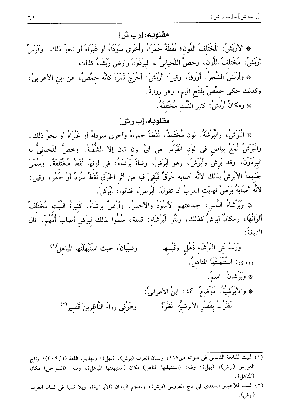 الْبَرَشُ والْبُرْشَةُ لون مُخْتَلِطٌ نُقْطةٌ حمراءُ وأخرى سوداءُ أو غَبْرَاءُ أو نحوُ ذلك والْبَرَشُ لُمَعُ بياضٍ في لوْنِ الْفَرَسِ من أيِّ لونٍ كان إلا الشُّهْبةُ وخصَّ اللّحيانِيُّ به البِرْذَوْنَ وقد بَرِش وأَبْرَشَ وهو أَبْرَشُ وشاةٌ بَرْشَاءُ في لونِهَا نُقَطٌ مُخْتَلِفَةٌ وسُمِّيَ جَذِيمةُ الأَبْرشُ بذلك لأنَّه أصابه حَرْقٌ فَبَقِيَ فيه من آَثَرِ الحَرْقِ نُقَطٌ سُودٌ أَوْ حُمْر وقيل لأنَّه أَصَابَهُ بَرَصٌ فهابَتِ العربُ أن تقولَ أَبْرَصَ فقالوا أَبْرَشَ وَبَرْشَاءُ النَّاسِ جماعتهم الأَسْوَدُ والأحمرُ وأَرْضٌ برشَاءُ كَثِيرَةُ النَّبْتِ مُخْتَلِفٌ أَلْوَانُهَا ومكانٌ أبرشُ كذلك وبَنُو الْبَرْشَاءِ قبيلة سُمُّوا بذلك لِبَرَشٍ أصابَ أُمَّهُمْ قال النابغةُ