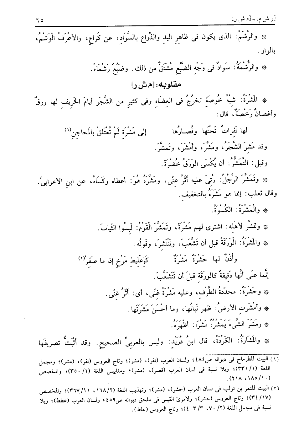 وقد مَشِرَ الشَّجَرُ ومَشَّرَ وأَمْشَرَ وتَمشَّرَ وقيل التَّمَشُّرُ أن يُكْسَى الوَرَقُ خُضْرَةً وتَمَشَّرَ الرَّجُلُ رُثِيَ عليه أَثَرُ غِنىً ومَشَّرَهُ هُوَ أعطاه وكَسَاهُ عن ابنِ الأعرابيِّ وقال ثعلب إنما هو مَشَرَهُ بالتخفيفِ والْمَشْرَةُ الكُسْوَةُ وتمشَّر لأهْلِه اشترى لهم مَشْرَةً وتَمَشَّرَ الْقَوْمُ لَبِسُوا الثّيابَ والمَشْرَةُ الْوَرَقَةُ قبل أن تَشَّعَبَ وتَنْتَشِرَ وقَولُه