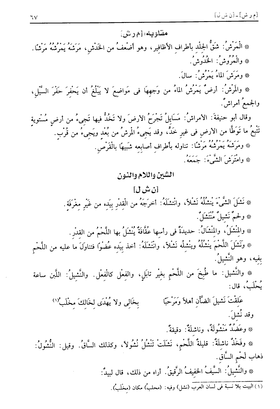 نَشَلَ الشَّيْءَ ينْشُلُهُ نَشْلاً وانْتشَلَهُ أخرَجَهُ من الْقِدْرِ بِيَدِه من غَيْرِ مِغْرَفَةٍ ولحمٌ نَشِيلٌ مُنْتَشَلٌ والمِنْشَلُ والمِنْشَالُ حديدَةٌ في رأسِها عُقَّافَةٌ يُنْشَلُ بها اللَّحْمُ من القِدْرِ وَنَشَلَ اللَّحْمَ ينْشُلُهُ وينْشِلُه نَشْلاً وانْتَشَلَهُ أخذ بِيَدِه عُضْواً فتناوَلَ ما عليه من اللَّحْمِ بَفِيه وهو النَّشِيلُ والنَّشيل ما طُبِخَ من اللَّحْمِ بغِيْر تابَلٍ والفِعْل كالْفِعْل والنَّشِيلُ اللَّبن ساعة يُحْلَبُ قال