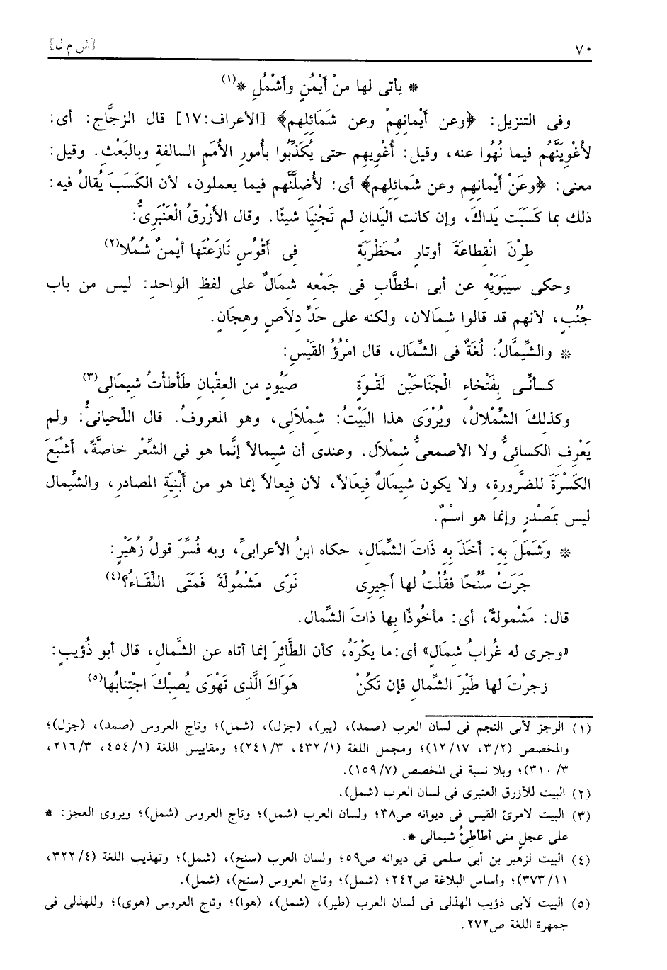 وكذِلكَ الشِّمْلالُ ويُرْوَى هذا البَيْتُ شِمْلاَلِي وهو المعروفُ قال اللّحيانيُّ ولم يَعْرفِ الكسائِيُّ ولا الأصمعيُّ شِمْلاَل وعندي أن شِيمالاً إنَّما هو في الشِّعْر خاصَّةً أَشْبَعَ الكَسْرَةَ للضَّرورِة ولا يكون شِيمَالٌ فِيعَالاً لأن فِيعالاً إنما هو من أَبْنِيَةِ المصادرِ والشِيمال ليس بمَصْدرٍ وإنما هو اسْمٌ وَشَمَلَ بِهِ أَخَذَ بِهِ ذَاتَ الشِّمَالِ حكاه ابنُ الأعرابيِّ وبه فُسِّرَ قولُ زُهَيْرٍ