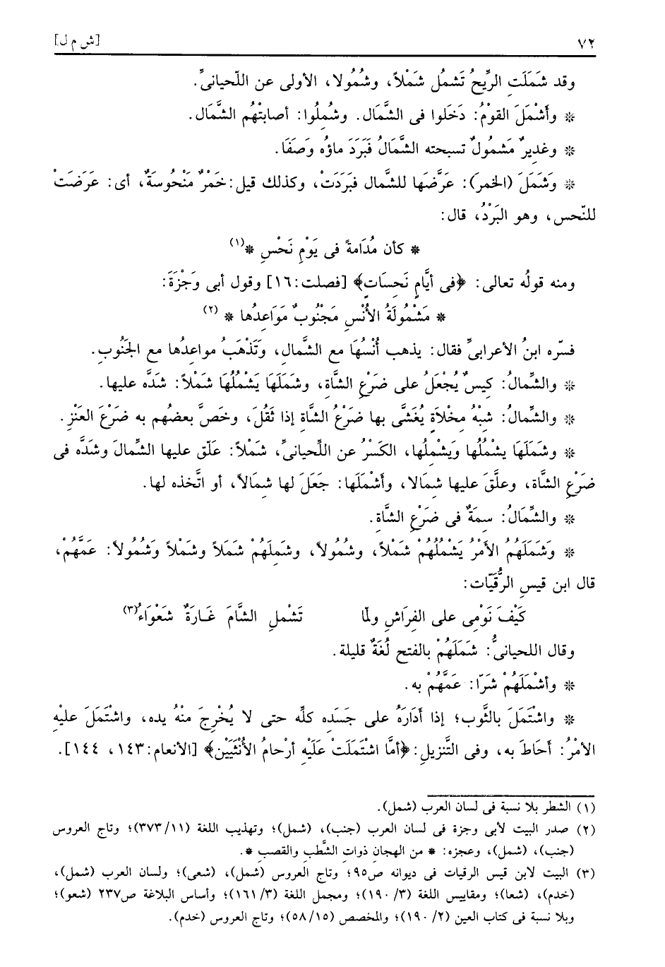 وقد شَمَلَتِ الرِّيحُ تَشمُل شَمْلاً وشُمُولا الأولى عن اللّحيانيِّ وأَشْمَلَ القوْمُ دَخَلوا في الشَّمَال وشُمِلُوا أصابتْهُم الشَّمَال وغدِيرٌ مَشمُولٌ تسبحته الشَّمَالُ فَبَرَدَ ماؤهُ وَصَفَا وَشَمَلَ الخمرَ عَرَّضَها للشَّمال فَبَرَدَتْ وكذلك قيل خَمْرٌ مَنْحُوسَةٌ أي عَرَضَتْ للنّحس وهو البَرْدُ قال
