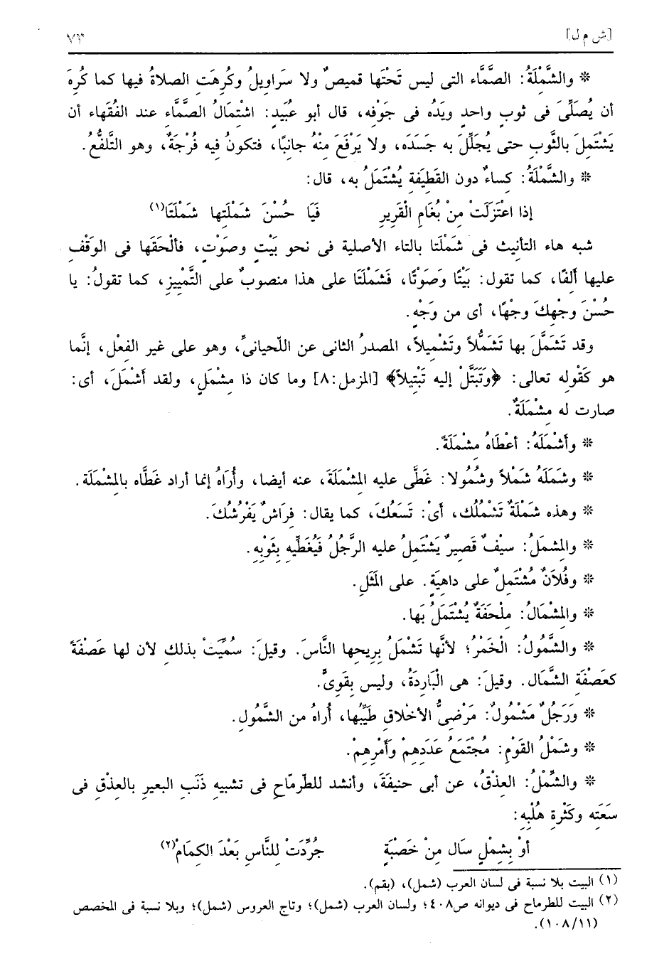 شبه هاء التأنِيث في شَمْلَتا بالتاء الأصلية في نحو بَيْتٍ وصَوْتٍ فألْحَقَها في الوَقْفِ عليها أَلِفاً كما تقول بَيْتاً وَصَوْتاً فَشَمْلَنَا على هذا منصوبٌ على التَّمْيِيزِ كما تقولُ يا حُسْنَ وَجْهِكَ وجْهاً أي من وَجْهٍ وقد تَشَمَّلَ بها تَشَمُّلاً وتَشْمِيلاً المصدرُ الثاني عن اللّحيانيِّ وهو على غير الفِعْل إنَّما هو كَقَولِه تعالى {وتبتل إليه تبتيلا} المزمل 8 وما كان ذا مِشْمَلٍ ولقد أَشْمَلَ أي صارت له مِشْمَلَةٌ وأَشْمَلَهُ أعْطَاهُ مِشْمَلَةً وشَمَلَهُ شَمْلاً وشُمُولاً غَطَّى عليه المِشْمَلَةَ عنه أيضاً وأُرَاهُ إنما أراد غَطَّاه بالمِشْمَلَة وهذه شَمْلَةٌ تَشْمُلُك أَيْ تَسَعُكَ كما يقال فِرَاشٌ يَفْرُشُكَ والمِشمَلُ سيْفٌ قَصِيرٌ يَشْتَمِلُ عليه الرَّجُلُ فَيُغَطِّيهِ بِثَوْبِهِ وفُلاَنٌ مُشْتَمِلٌ على داهِيَةٍ على المَثَلِ والمِشْمَالُ مِلْحَفَةٌ يُشْتَمَلُ بهَا والشَّمُولُ الْخَمْرُ لأنَّها تَشْمَلُ بِرِيحِها النَّاسَ وقيلَ سُمِّيَتْ بذلكِ لأن لها عَصْفَةً كعَصْفَةِ الشَّمَالِ وقيلَ هي الْبَارِدَةُ وليس بِقَوِيٍّ وَرَجُلٌ مَشْمُولٌ مَرْضِيُّ الأخْلاقِ طَيِّبُها أُراهُ من الشَّمُولِ وشَمْلُ القَوْمِ مُجْتَمَعُ عَدَدِهِمْ وَأَمْرِهِمْ والشِّمْلُ العِذْقُ عن أبي حنيفَةَ وأنشد للطّرمّاحِ في تشبيهِ ذَنَبِ البعيرِ بالعِذْقِ في سَعَتِه وكَثْرَةِ هُلْبِهِ