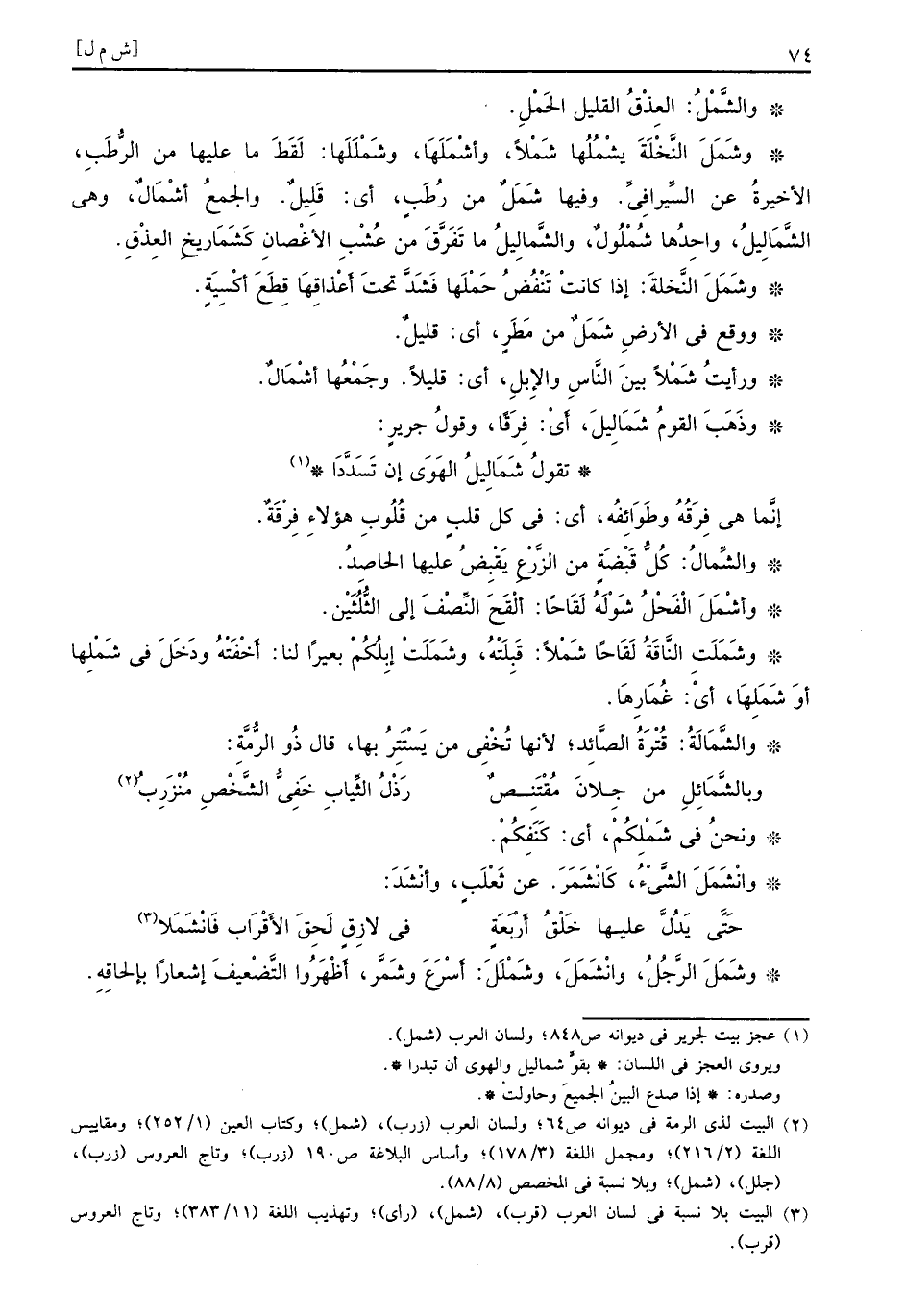والشَّمْلُ العِذْقُ القليل الحَمْلِ وشَمَلَ النَّخْلَةَ يشْمُلُها شَمْلاً وأشْمَلَهَا وشَمْلَلَها لَقَطَ ما عليها من الرُّطَبِ الأخيرةُ عن السِّيرافِيِّ وفيها شَمَلٌ من رُطَبٍ أي قَلِيلٌ والجمعُ أشْمَالٌ وهي الشَّمَالِيلُ واحِدُها شُمْلُولٌ والشَّمالِيلُ ما تَفَرَّقَ من عُشْبِ الأغْصانِ كَشَمَاريخِ العِذْقِ وشَمَلَ النَّخلةَ إذا كانتْ تَنْفُضُ حَمْلَها فَشَدَّ تحتَ أَعْذاقِهَا قِطَعَ أكْسِيَةٍ ووقع في الأرضِ شَمَلٌ من مَطَرٍ أي قليلٌ ورأيتُ شَمْلاً بينَ النَّاسِ والإِبِلِ أي قليلاً وجَمْعُها أشْمَالٌ وذَهَبَ القومُ شَمَالِيلَ أَيْ فِرَقاً وقولُ جريرٍ
