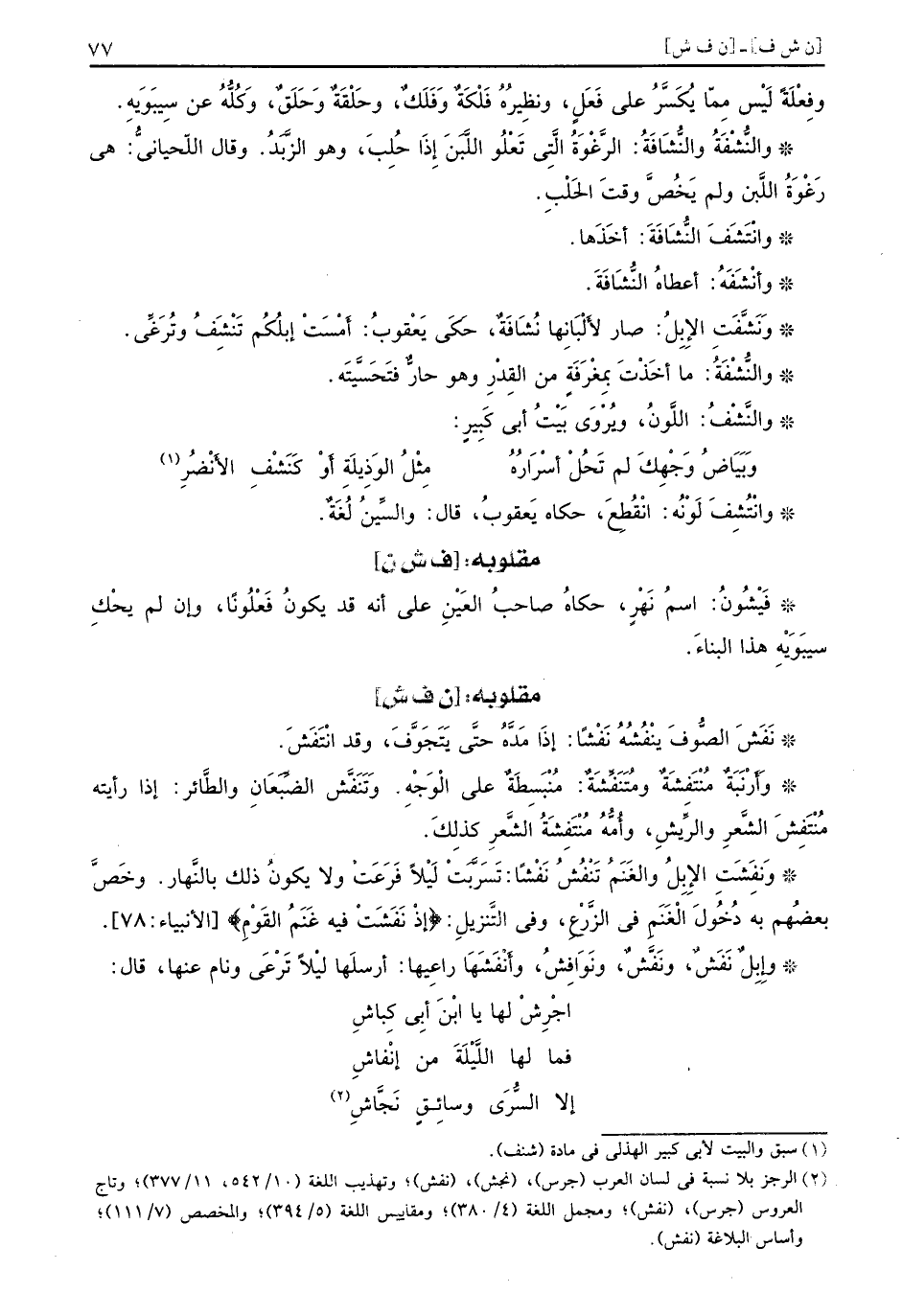 نَفَشَ الصُّوفَ ينْفُشُهُ نَفْشاً إذَا مَدَّهُ حتَّى يَتَجَوَّفَ وقد انْتَفَشَ وأَرْنَبَةٌ مُنْتَفِشَةٌ ومُتَنَفِّشَةٌ مُنْبسِطَةٌُ على الْوَجْهِ وتَنَفَّشَ الضِّبْعَانِ والطَّائر إذا رأيته مُنْتَفِشَ الشَّعرِ والرِّيشِ وأُمُّهُ مُنْتَفِشَةُ الشَّعرِ كذلِكَ وَنَفَشَتِ الإِبِلُ والغَنَمُ تَنْفُشُ نَفْشاً تَسَرَّبَتْ لَيْلاً فَرَعَتْ ولا يكونُ ذلك بالنَّهارِ وخَصَّ بعضُهم به دُخُولَ الْغَنَمِ في الزَّرْعِ وفي التَّنزيلِ {إذ نفشت فيه غنم القوم} وإِبِلٌ نَفَشٌ ونَفَّشٌ ونَوَافِشُ وأَنْفَشَهَا راعِيها أرسلَها ليْلاً تَرْعَى ونام عنها قال