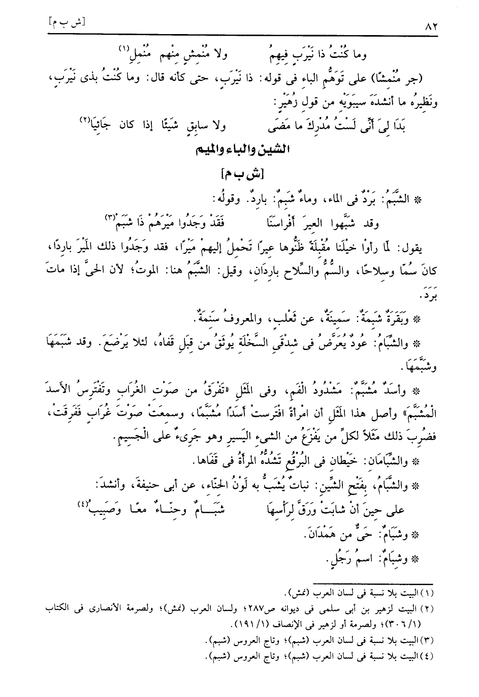 يقول لمّا رأوْا خيْلَنا مُقْبِلَةً ظنُّوها عِيراً تَحْمِلُ إليهمْ مَيْراً فقد وَجَدُوا ذلك المَيْرَ بارِداً كانَ سُماً وسِلاحاً والسُّمُّ والسِّلاح بارِدَانِ وقيل الشَّبَمُ هنا الموتُ لأن الحيَّ إذا ماتَ بَرَدَ وَبَقَرَهٌ شَبِمَةٌ سَمِينَةٌ عن ثَعْلبٍ والمعروفُ سَنِمَةٌ والشِّبَامُ عُودٌ يُعَرَّضُ في شِدْقَيِ السَّخْلةِ يُوثَقُ من قِبَلِ قَفاهُ لئلا يَرْضَعَ وقد شَبَمَهَا وشَبَّمَهَا وأسَدٌ مُشَبَّمٌ مَشْدُودُ الْفَمِ وفي المَثَلِ تَفْرَقُ من صَوْتِ الغُرَابِ وتَفْتَرِسُ الأَسدَ الْمُشَبَّمَ وأصل هذا المَثَلِ أن امْرأةً افْتَرستْ أَسَدَاً مُشَبَّماً وسمِعَتْ صَوْتَ غُرَابٍ فَفَرِقَتْ فضُرِبَ ذلك مَثَلاً لكلِّ من يَفْزَعُ من الشيءِ اليَسيرِ وهو جَرِئٌ على الْجَسِيمِ والشِّبَامَانِ خَيْطُانِ في البُرْقُعِ تَشُدُّهُ المرأَةُ في قَفَاها والشَّبَامُ بِفَتْحِ الشِّينِ نباتٌ يُشَبُّ به لَوْنُ الحِنّاءِ عن أبي حنيفةَ وأنشدَ