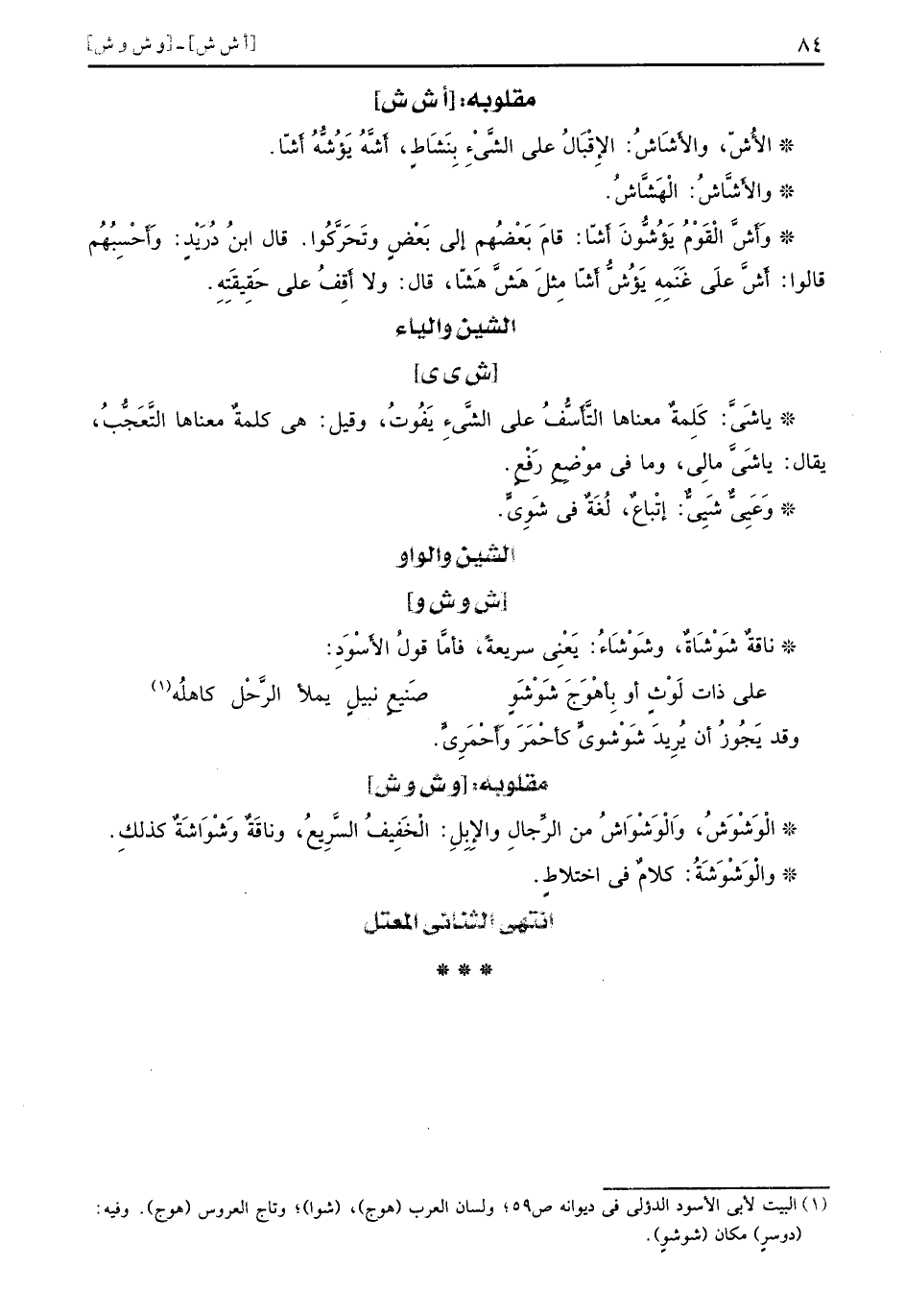 الأُشّ والأَشَاشُ الإِقْبَالُ على الشَّيْءِ بِنَشَاطٍ أَشَّهُ يَؤُشُّهُ أَشاً والأَشَّاشُ الْهَشَّاشُ وَأَشَّ الْقَوْمُ يَؤُشُّونَ أشاً قامَ بَعْضُهم إلى بَعْضٍ وتَحَرَّكُوا قال ابنُ دُرَيْدٍ وَأَحْسِبُهُم قالوا أَشَّ علَى غَنَمِهِ يَؤُشُّ أَشاً مِثلَ هَشَّ هَشاً قال ولا أَقِفُ على حَقِيقَتِهِ