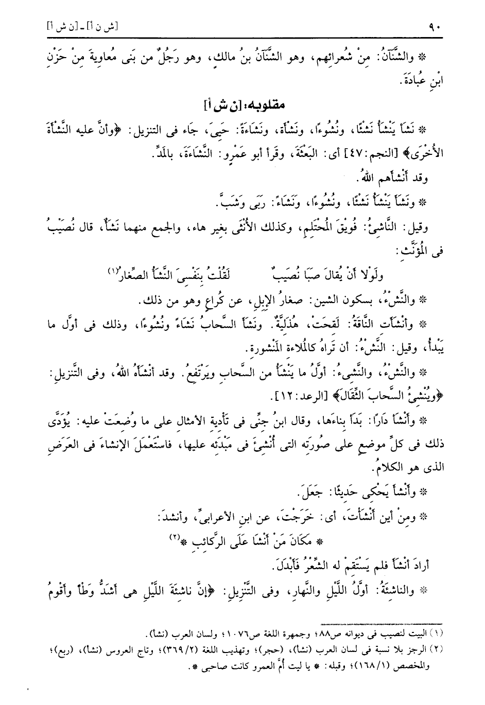 أرادَ أنْشَأَ فلم يَسْتقِمْ له الشِّعْرُ فَأَبْدَلَ والناشِئَةُ أوَّلُ اللَّيْلِ والنَّهارِ وفي التَّنْزِيلِ {إنَّ ناشِئَةَ اللَّيْلِ هي أَشَدُّ وَطْأً وأَقْومُ