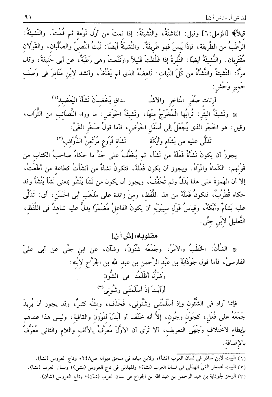قِيلاً} المزمل 6 وقيل: الناشِئَةُ والنَّشيئَةُ إذا نِمتَ من أولَّ نَوْمةٍ ثم قُمْتَ والنّشيئَةُ الرَّطْبُ من الطَّريفة فإذَا يَبِسَ فهو طَرِيفَةٌ والنَّشيئَةُ أَيْضاً نَبْتُ النَّصِيِّ والصِّلِّيانِ والقَوْلانِ مُقْتَرِبان والنَّشِيئَةُ أيضاً التَّفِرةُ إذا غَلُظَتْ قَليلاً وارتْفَعتْ وهي رَطْبَةٌ عن أبي حَنِيفةَ وقال مرَّةُ النَّشيئةُ والنَّشْأَةُ من كُلِّ النَّباتِ نَاهِضُهُ الذي لم يَغْلُظْ وأنشد لابنِ مَنَاذِرَ في وَصْفِ حَمِيرِ وَحْشٍ