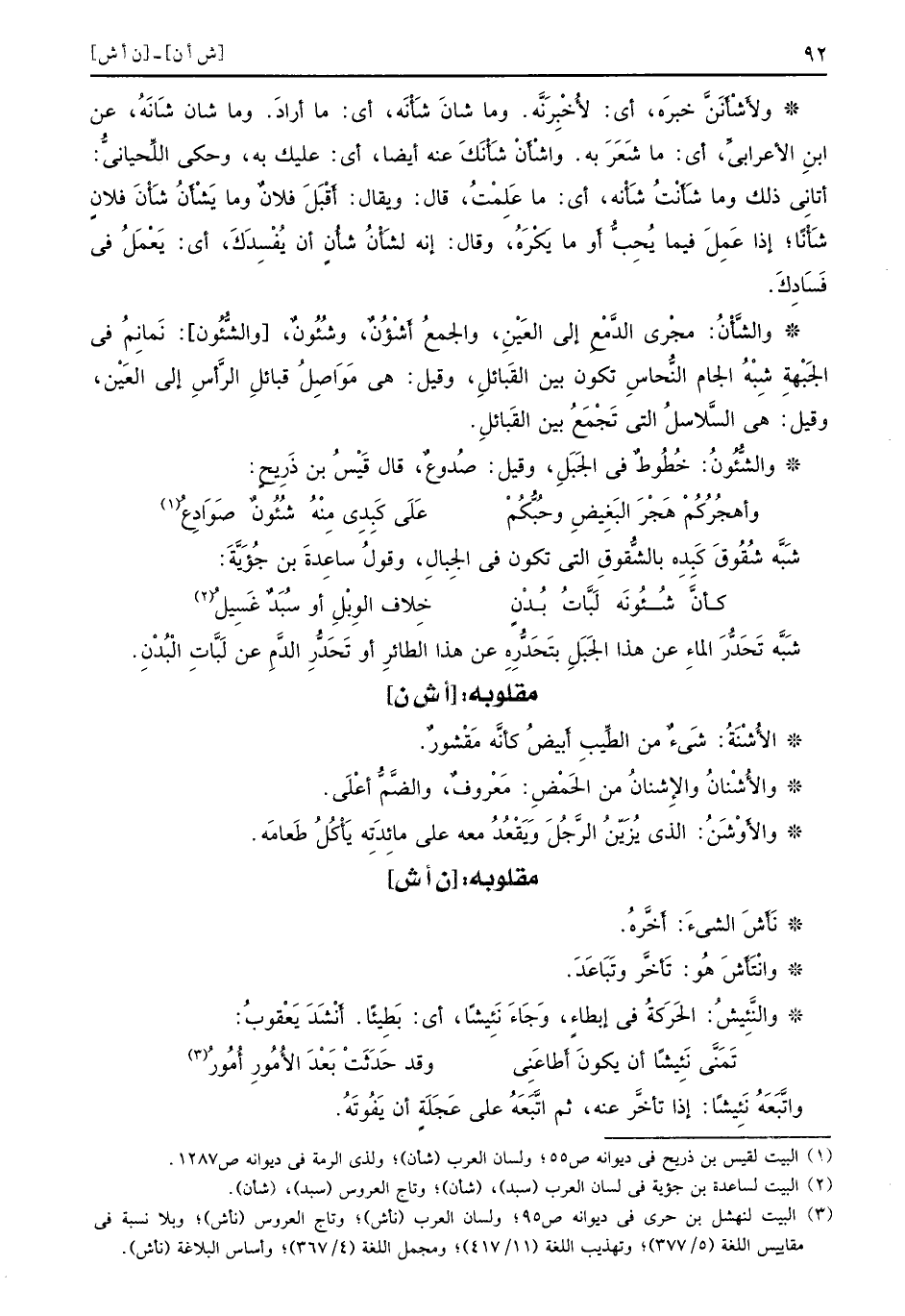 ولأَشْأَنَنَّ خبرَه أي لأُخْبِرَنَّه وما شانَ شَأْنَه أي ما أرادَ وما شان شَانَهُ عن ابنِ الأعرابيِّ أي ما شَعَرَ به واشْأَنْ شَأْنَكَ عنه أيضا أي عليك به وحكى اللِّحيانيُّ أتانِي ذلك وما شَأَنْتُ شَأْنه أي ما عَلِمْتُ قال ويقال أَقْبَلَ فلانٌ وما يَشْأَنُ شَأْنَ فلانٍ شَأْنًا إذا عَمِلَ فيما يُحِبُّ أَو ما يَكْرَهُ وقال إنه لشَأْنُ شأُنٍ أن يُفْسِدَكَ أي يَعْمَلُ في فَسَادِكَ والشَّأْنُ مجْرى الدَّمْعِ إلى العَيْنِ والجمعُ أَشْؤُنٌ وشُئُونٌ والشُّئُون نَمانِمُ في الجَبْهةِ شِبْهُ الجام النُّحاسِ تكون بين القَبائِلِ وقيل هي مَوَاصِلُ قبائلِ الرَّأسِ إلى العَيْن وقيل هي السَّلاسلُ التي تَجْمَعُ بين القَبائلِ والشُّئُونُ خُطُوطٌ في الجَبَلِ وقيل صُدوعٌ قال قَيْسُ بن ذَرِيحٍ