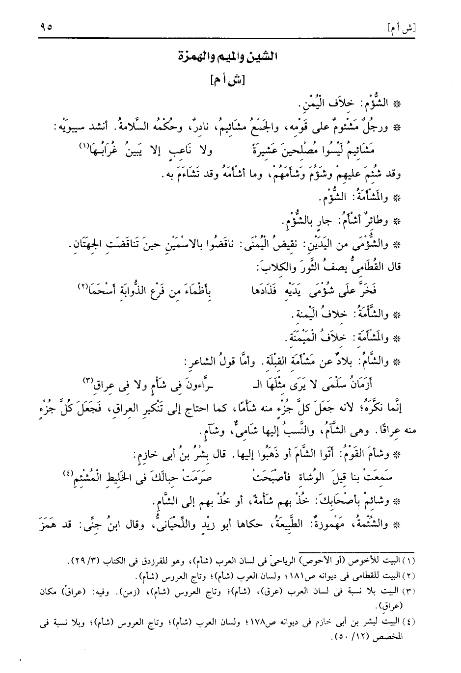 والشَّأْمَةُ خِلافُ اليَمْنةِ والمَشْأَمَةِ خِلافُ الْمَيْمَنَةِ والشَّامُ بلادٌ عن مَشْأَمَةِ القِبْلَةِ وأمَّا قولُ الشاعرِ