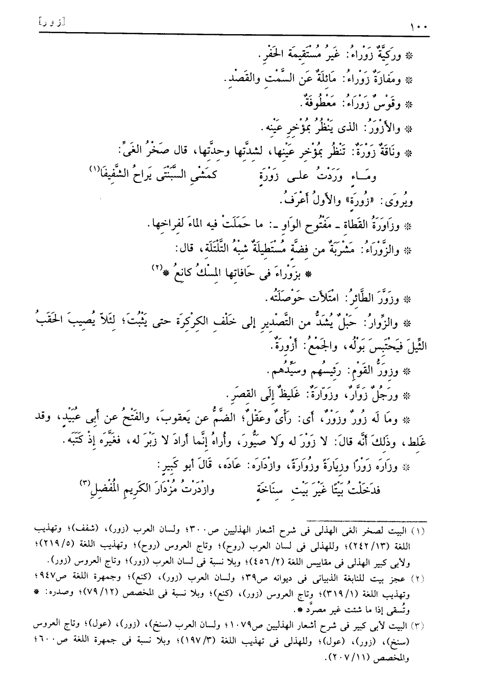 ورَكِيَّةٌ زَوْراءُ: غَيرُ مُسْتِقيمَة الحَفْرٍ. ومَفازَةٌ: زَوْؤاءَُ: مَائِلَةٌ عَن السَّمْتِ والقَصْدِ. وقُوْسُ زَوْرَاءُ: مَعْطُوفَةٌ. والأَزْوَرُ: الذي يَنْظُرُ بُمؤْخِرِ عَيْنْه. ونَاقَةٌ زَوْرَةٌ: تَنْظُر بُمؤْخَر عَنِيها، لِشدتَّها وِحدًّتِها، قال صَخْرُ الغَيِّ: