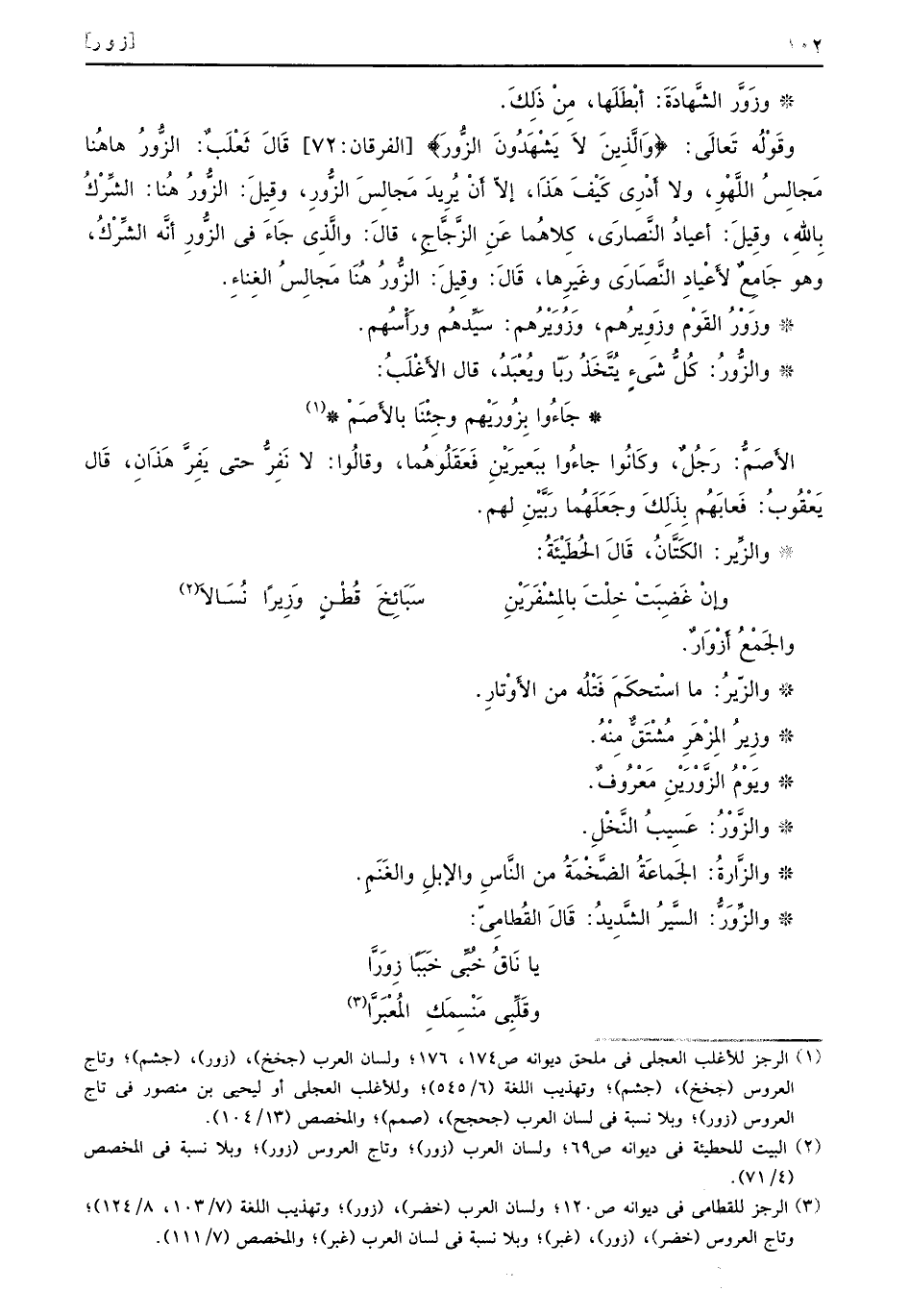 وزَورَّ الشَّهادَةَ: أبْطَلَها، مِنْ ذَلِكْ. وقَوْلُه تَعالَى: {والذين لا يشهدون الزور} [الفرقان: 72] قَالَ ثَعْلَبٌ: الزُّورُ هاهُنا مَجِالِسُ اللَّهْوِ، ولا أَدْرِي كَيْفَ هَذَا، إلاّ أَنْ يُريدَ مَجالِسَ الزُّورِ، وقِيلَ: الزُّورُ هُنا: الشِّرْكُ بِاللهِ، وقِيلَ: أعيادُ النَّصارَى، كِلاهُما عَنِ الزَّجَّاجِ، قالَ: والَّذِي جاَءَ في الزُّورِ أَنَّه الشِّرْكُ. وهو جَامِعٌ لأَعْيادِ النَّصارَى وغَيرِها، قَالَ: وقِيلَ: الزُّورُ هُنَا مَجالِسُ الغِناءِ. وزَوْرُ القَوْم وزَوِيرُهم، وزَوُيَرْهُم: سَيِّدهُم ورَأْسُهم. والزُّورُ: كُلُّ شَيءٍ يَتَّخَذُ رَبّا ويُعْبَدُ، قال الأَغْلَبُ: