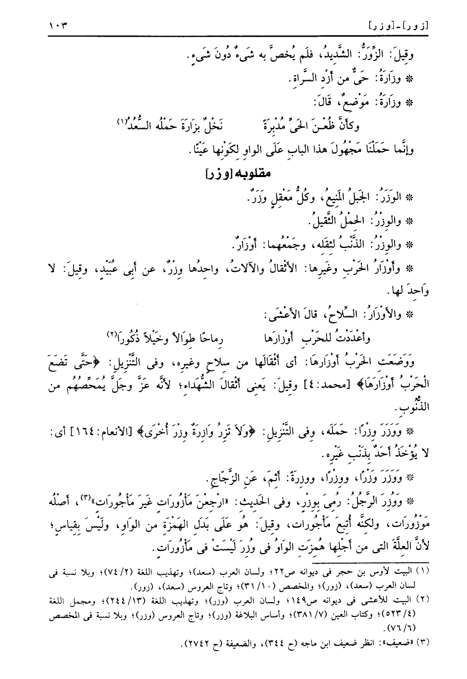 وَوَضَعَتِ الحَرْبُ أَوْزارهَا: أي أَثْقَالَها من سِلاحِ وغيرِه، وفي التَّنْزِيلِ: {حتى تضع الحرب أوزارها} [محمد: 4] وقِيلََ: يَعِني أَثْقالَ الشُّهَداءِ؛ لأَنَّه عَزَّ وجَلَّ يُمَحِّصُهُم من الذُّنُوبِ. وَوَزَرَ وَزْراً: حَمَلَه، وفِي التَّنْزِيلِ: {ولا تزر وازرة وزر أخرى} [الأنعام: 164] أي: لا يُؤْخَذُ أَحَدٌ بِذَنْبِ غَيْرِه. وَوَزَرَ وَزْراً، ووِزْراً، ووزِرَةً: أَثِمَ، عَنِ الزَّجّاجِ. وَوُزَرَ الرَّجُلُ: رُمِي بِوْزْرٍ، وفي الحَدِيثِ: ((ارْجِعَنَ مَأْزُوَارتِ غَيرَ مَأْجُورَاتٍ)) ، أَصْلُه مَوْزُورَات، ولكِنَّه أُتِبعَ مَأْجُورات، وقِيلَ: هُو عَلَى بَدَلِ الهَمْزَةٍ من الوَاوِ، ولَيْسَ بِقِياسٍ؛ لأَنَّ العِلَّةَ التي من أَجْلِها هَمَزَتِ الوَاوُ في وُزِرَ لَيْسَتْ في مَأْزُورَاتٍ.
