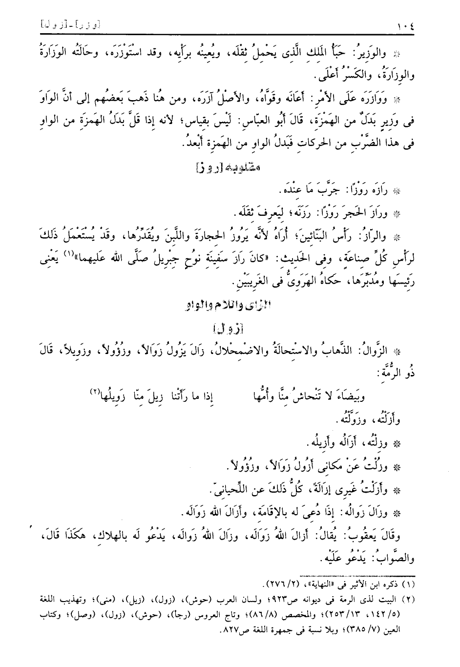 [ز ول] الزَّوالُ: الذَّهابُ والاسْتِحالَةُ والاضْمِحْلالُ، زَالَ يَزُولُ زَوَالاً، وزُؤُولاً، وزَوِيلاً، قَالَ ذُو الرُّمَّةِ: