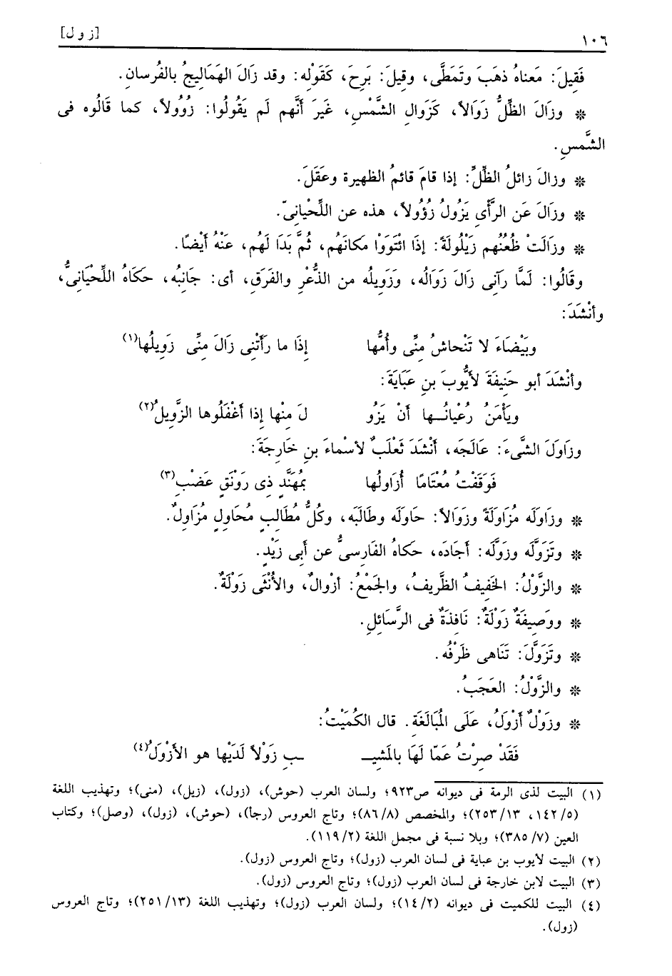 فَقيلَ: مَعناهُ ذهَبَ وتَمَطَّي، وقِيلَ: بَرِج، كَقَوِلْه: وقد زَالَ الهَمَالِيجُ بالفُرسان. وزَالَ الظِّلُّ زَوَالاً، كَزَوالِ الشَّمْسِ، غَيرَ أَنَّهم لَم يَقُولُوا: زُوُولاً، كما قَالُوه في الشَّمسٍ. وزالَ زَائلُ الظِّلِّ: إذا قامَ قائُم الظَهيرةَ وعَقَل. وزَالَ عَن الرَّأْيِ يَزُولُ زُؤُولاً، هذه عن اللِّحْيانِيّ. وزَالَتْ ظُعُنُهم زَيْلُولَةً: إذاَ ائْتَوَواْ مَكانَهُم، ثُمَّ بَدَا لَهُم. عَنْهُ أَيْضاً. وقَالُوا: لَمَّا رآنِي زَالَ زَوَالُه، وَزَوِيلُه من الذُّغْرِ والفَرَقِ، أي: جَانِبُه، حَكَاهُ اللِّحْيَانِيُّ، وأنْشَدَ.