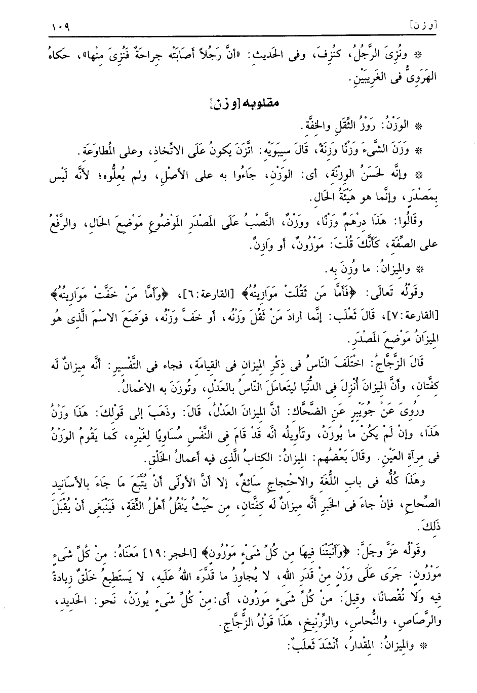 [وز ن] الوَزْنُ: رَوْزُ الثِّقَلِ والخِفَّةِ. وَزَنَ الشَّيءَِ وَزْناً وَزِنَةً، قَالَ سِيبَوَيْهِ: اتَّزَنَ يَكونُ عَلَى الاتِّخاذِ، وعلى المُطاوَعَةِ. وإنَّه لَحَسنُ الوِزْنَةِ، أي: الوَزْنِ، جَاءُوا به على الأَصْلِ، ولم يَعِلُّوه؛ لأَنَّه لَيْس بِمَصْدَرٍ، وإنَّما هو هَيْئَةُ الحَالِ. وقَالُوا: هَذَا دِرْهَمٌ وَزْناً، ووَزْنٌ، النَّصْبُ عَلَى المَصْدِرِ المَوْضُوعِ مَوْضِعَ الحَالِ، والرَّفْعُ على الصِّفَةِ، كَأَنَّكَ قُلْتَ: مَوْزُونٌ، أَو وَازِنٌ. والمِيزانُ: ما وَزِنَ بِه. وقَوْلُه تَعالَي: {فأما من ثقلت موازينه} [القارعة: 6] ، {وأما من خفت موازينه} [القارعة: 7] ، قَالَ ثَعْلَب، إنَّما أرادَ مَنْ ثَقُلَ وَزْنُه، أَو خَفَّ وَزْنُه، فوَضَعَ الاسْمَ الَّذِي هُو المِيزَانُ مَوْضِعَ المَصْدَرِ. قَالَ الزَّجَّاجُ: اخْتَلَفَ النّاسُ في ذِكْرِ المِيزانِ في القيِامَةِ، فجاء في التَّفْسِيرِ: أَنَّه مِيزانٌ لَه كِفَّتانِ، وأّنَّ المِيزانَ أُنْزِلَ في الدُّنَيا ليتَعامَلَ النّاسُ بالعَدْلِ، وتُوزَنَ به الأعْمالُ. ورَوِيَ عَنْ جُوَيْبِرٍ عَنِ الضَّحَّاكِ: أنَّ المِيزانَ العَدْلُ، قَالَِ: وذَهَبَ إلى قَوْلِكَ: هَذَا وَزْنُ هَذَا، وإنْ لَمْ يَكُنْ ما يُوزَنُ، وتَأْوِيلُه أنَّه قَدْ قَامَ فِي النَّفْسِ مُسَاوِياً لِغَيْرِه، كَما يَقُومُ الوَزْنُ في مِرآةِ العَيْنِ. وقَالَ بَعْضُهم: المِيزانُ: الكِتابُ الَّذِي فيه أَعمالُ الخَلْقٍ. وهَذَا كُلُّه في بابِ اللُّغَةِ والاحْتِجاجِ سَائِغٌ، إلا أَنَّ الأَوْلَى أَنْ يَتَّبَعَ مَا جَاءَ بالأَسَانِيدِ الصِّحاحِ، فإنْ جاءَ في الخَبرِ أَنَّه مِيزانٌ لَه كِفَّتانِ، مِن حَيْثُ يَنْقُلُ أَهْلُ الثِّقَةِ، فَيَنْبَغِي أَنْ يُقْبَلَ ذَلِكَ. وقَوْلُه عَزَّ وجَلَّ: {وَأَنْبَتْنَا فِيهَا مِن كُلِّ شَيْءَ مَوْزُونٍ} [الحجر: 19] مَعْنَِاهُ: مِنْ كُلِّ شَيءٍ مَوْزُونٍ: جَرَى عَلَى وَزْنٍ مِنْ قَدَرِ اللهِ، لا يُجاوِزُ ما قَدَّرَه اللهُ عَلَيهِ، لا يَستَطِيعُ خَلْقٌ زِيادةً فِيه وَلا نُقْصاناً، وقِيلَ: منْ كُلِّ شَيٍْ مَوزُونٍ، أَي: مِنْ كُلِّ شَيءٍ يُوزَنُ، نَحو: الحَدِيدِ، والرَّصَاصِ، والنُّحاسِ، والزِّرْنِيخِ، هَذَا قَوْلُ الزَّجَّاجِ. والمِيزانُ: المِقْدارُ، أَنْشَدَ ثَعلَبٌ.
