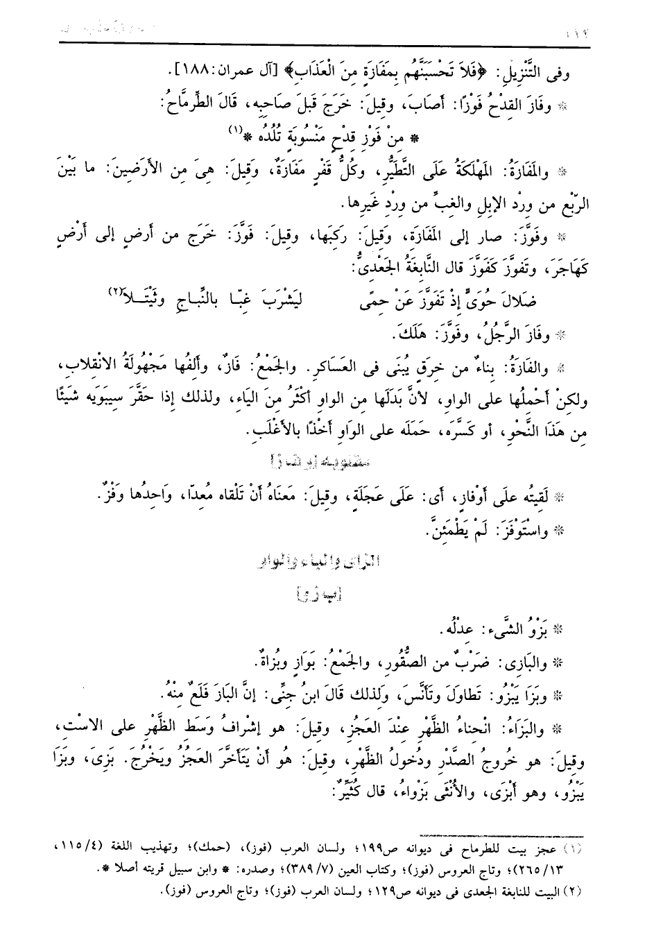 وفي التَّنْزيلٍ: {فلا تحسبنهم بمفازة من العذاب} [آل عمران: 188] . وفَازَ القِدْحُ فَوْزاً: أَصَابَ، وقِيلَ: خَرَجَ قَبلَ صَاحِبِه، قَالَ الطِّرمَّاحُ: