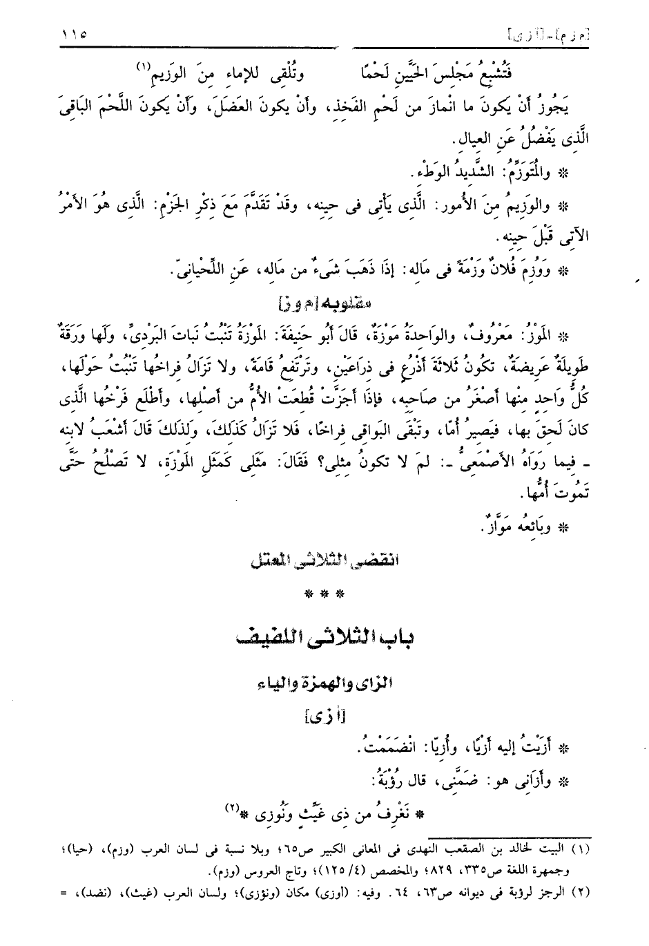 يَجُوزُ أَنْ يَكونَ ما انْمازَ من لَحْمِ الفَخِذِ، وأَنْ يكونَ العَضَلَ، وَأَنْ يَكَونَ اللَّحْمَ البَاقِيَ الَّذِي يَفْضُلُ عَنِ العِيالِ. والمَتَوَزَمُ: الشَّديدُ الوَطْءِ. والوَزِيمُ مِنَ الأُمور: الَّذيِ يَأْتِي في حِينِه، وقَدْ تَقَدَّمَ مَعَ ذِكْرِ الجَزْمِ: الَّذِي هَوَ الأَمْرُ الآتِي قَبْلَ حِينه. وَوْزَمَ فُلانٌ وَزْمَةً في مَالِه: إذاَ ذَهَبَ شَيءٌ من مَالِه، عَنِ اللِّحْيانِيّ.