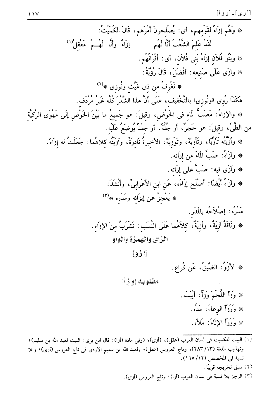 هَكذَا رُوِي ((ونُوزِي)) بالتَّخْفيفِ، عَلَى أَنَّ هذا الشِّعْرَ كُلَّه غَيرُ مُرْدَفٍ. والإزاءُ: مَصَبُّ المَاءِ في الخَوْضِ، وقِيلَ: هو جِميعُ ما تبَيْنَ الحَوْضِ إلَى مَهْوَى الرَّكِيَّةِ من الطيِّ، وقِيلَ: هو حَجٌ ر. أَو جُلَّةٌ، أو جلِْدٌ يُوضَعُ عَلَيْهَِ. وأَزَّيْتُه تَأَزَّياً، وتَأزِيَةً، وتَوْزَيةً، الأَخِيرةُ نَادِرَةٌ، وآزَيْتُه كلاِهُما: جَعَلْتُ له إِزَاءَ. وآزَاهُ: صَبَّ المَاءَ مِن إِزَائِه. وآزَي فيِه: صَبَّ على إِزَائِه. وآزَاهُ أَيْضاً: أَصْلَح إزَاءه، عَنِ ابنِ الأَعْرابِيٍّ، وأَنْشَد: