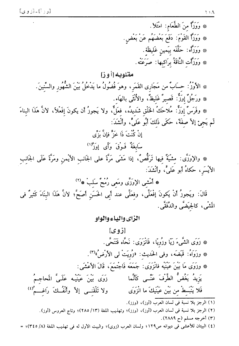 [أوز] الأَوْزُ: حَسابٌ من مَجَارِي القَمِرِ، وهوَ فُضُولُ ما يَدْخُلُ بَيْنَ الشُّهُورِ والسِّنِينَ. ورَجُلٌ إِوَزَّ: قَصٍ يرٌ غَلِيظٌ، والأُنْثَى بالهَاءِ. وفَرَسٌُ إِوَزٌّ: مُلاحِكَ الخَلْقٍ شَدِيدُه، فِعَلُّ، ولا يَجوزُ أَن يكونَ إِفَعْلاً، لأنَّ هّذَا البِناءَ لَم يِجِيء إلاً صِفَةً، حَكَي ذَلِكَ أَبُو عَلّى وأَنْشَدَ: