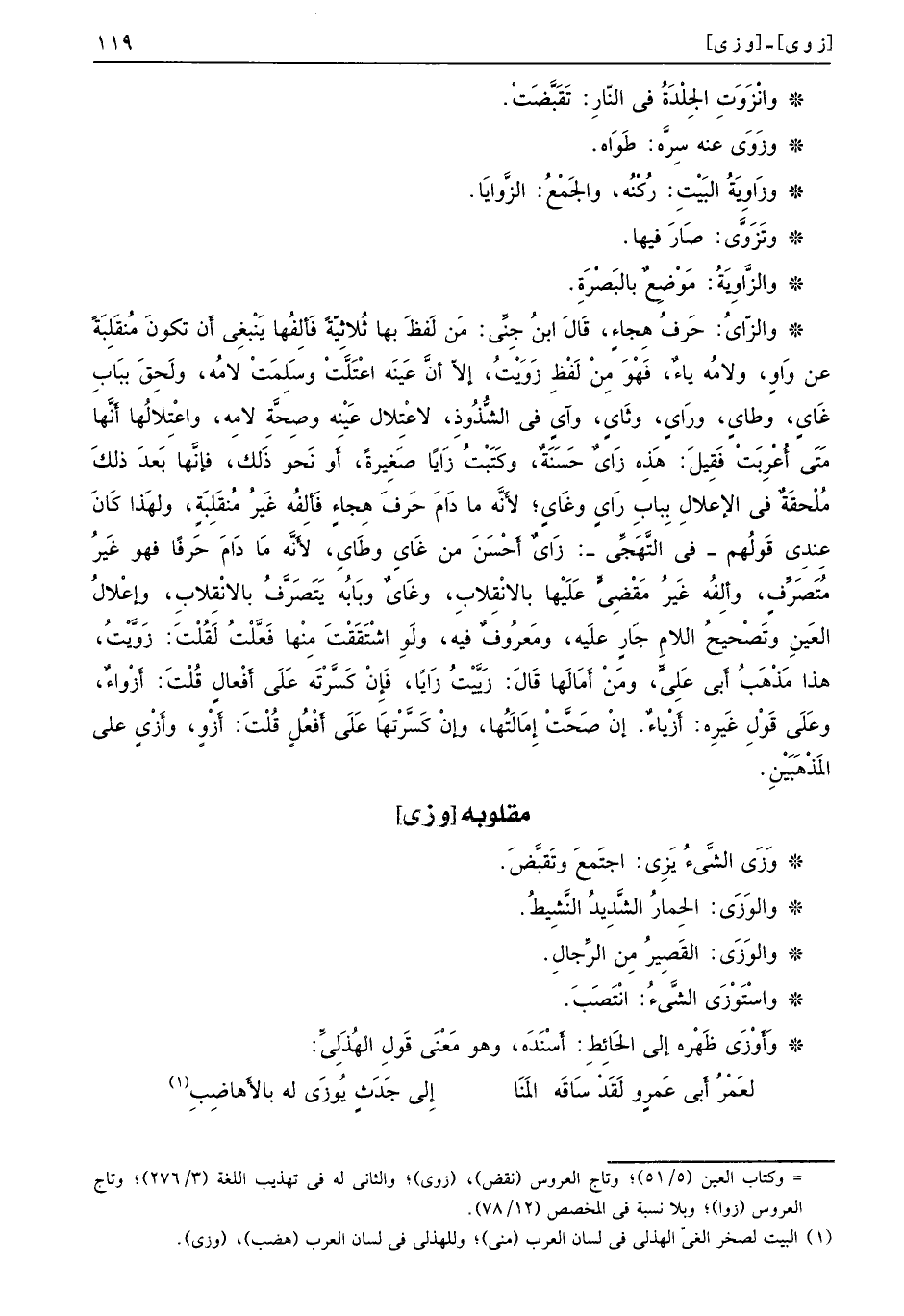 وانْزَوَتِ الجِلْدَةُ في النّارِ: تَقَبَّضَتْ. وزَوَي عنه سِرَّه: طَوَاه. وزَاوِيَةُ البَيْتِ: رُكْنُه، والجَمْعُ: الزَّوايَا. وتَزَوَّي: صَارَ فيها. والزَّاوِيَةُ: مَوْضِعٌ بالبَصْرَةِ. والزّايُ: حَرفًُ هِجاءٍ، قَالَ ابنُ جِنِّي: مَن لَفظَ بها ثُلاثِيّةً فَألِفُها يَنْبَغِي أَن تكونَ مُنقَلِبَةً عن وَاوٍ، ولامُه ياءٌ، فَهْوَ مِنْ لَفْظِ زَوِيْتُ، إلاّ أنَّ عَينَه اعْتَلَّتْ وسَلِمَتْ لامُه، ولَحِقَ ببَابِ غَايٍ، وطايٍ، ورَايٍ، وثَايٍ، وآيٍ في الشُّذُوذِ، لاعْتِلال عَيْنِه وصِجَّةِ لامِه، واعْتِلالُها أَنًّها مَتَى أُغْرِبَتْ فَقِيلَ: هَذه زَايٌ حَسَنَةٌ، وكَتَبْتُ زَاياً صَغِيرةً، أًَو نَحو ذَلك، فإنَّها بَعدَ ذلكَ مُلْحقَةٌ في الإعلالِ بِبابِ رَاى وغَاي؛ لأَنَّه ما دَامَ حَرفَ هِجاءٍ فَألِفُه غَيرُ مُنقَلِبَةٍ، ولهذَا كَانَ عِندِي قَولُهم - في التَّهَجِّي -: زَايٌ أَحْسَنَ من غَايٌ وطَايٍ، لأَنَّه مَا دَامَ حَرفاً فهو غَيرُ مُتَصَرِّفٍ، وألِفُه غَيْر مَقْضِيٍّ عَلَيْها بالانْقِلابِ، وغَايٌ وبَابَه يَتَصرَّفُ بالانْقِلابِ، وإعْلالُ العَينِ وتَصْحيحُ اللامِ جَارٍ علَيه، ومَعْروفٌ فيه، ولَوِ اشْتَقَتْتَ مِنها فَعَّلْتُ لَقُلْتَ: زَوَّيْتُ، هذا مَذْهِبُ أَبي عَلِيٍّ، ومَنْ أَمَالَها قَالَ: زَبَّيْتُ زَاياً، فَإِنْ كَِسَّرْتَه عَلَى أَفْعالِ قُلْتَ: أَزواءٌ وعَلَِى قَوْلِ غَيرِه: أَزْياءٌ. إنْ صَحَّتْ إِمَالَتُها، وإنْ كَسَّرْتَها عَلَى أَفْعْلٍ قُلْتَ: أَزْوٍ، وأَزْيٍ على المَذْهَبَيْنِ.