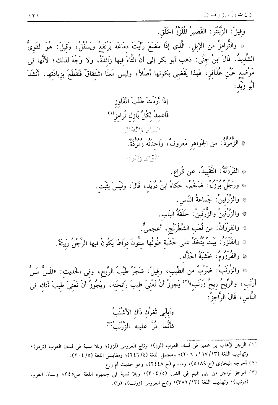 الفَرْزَلَةُ: التَّقْيِيدُ، عن كُراع. ورَجُلٌ بُرْزُلٌ: ضَخْمٌ، حَكاهُ ابنُ دُرَيْدٍ، قال ولَيْسَ بَثْبتٍ. والزَّرفين: جماعة الناس والزِّرْفِينُ والزُّرْفِينُ: حَلْقَهُ البَابِ. والفِرْزَانُ: من لُعَبِ الشِّطَرَنْجِ، أَعجميٌّ. والفَنْزَرُ: بَيْتٌ يُتَّخَذُ على خَشَبٍ ة طُولُها سِتُّونَ ذِرَاعاً يَكُونُ فيها الرَّجُلُ رَبِيئةً. والفُرْزُومُ: خَشَبَةُ الحَذَّاءِ. والزَّرْنَبُ: ضَرْبٌ من الطِّيبِِ، وقٍ يلَ: شَجَرٌ طَيِّبُ الرِّيحِ، وفيِ الحَديثِ: ((المَسُّ مَسُّ أَرْنَبٍ، والرِّيحُ رِيحُ زَرْنَبًِ)) يَجوزُ أَنْ تَعْنَيَ طِيبَ رَائِحِتَه، وَيُجوزُ أَنْ تَعْنِيَ طِيبَ ثَنائِه في النَّاسِ، قَالَ الرَّاجِزُ: