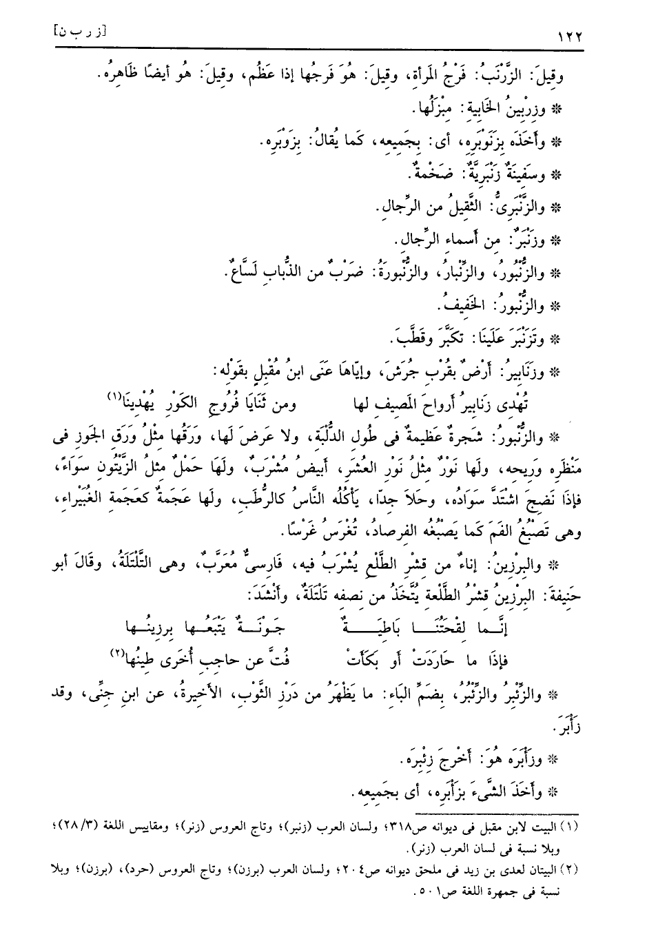 وقِيلَ: الزَّرْنَبُ: فَرْجُ المَرأةِ: وقِيلَ: هَوَ فَرجُها إذا عَظُم، وقِيلَ: هُو أيضاً ظَاهِرُه. وزِرِبْينُ الخَابِيةِ: مِبْزَلُها وأَخَذَه بَزنوَبْرَهِ، أي: بِجَمِيِعه، كَما يُقالُ: بَزَوْبَرِه. وسَفِينَةٌ زَنْبَرِيَّةٌ: ضَخَمْةٌ. والزَّنْبَرِيُّ: الثَّقِيلُ من الرِّجالِ. وزَنْبَرٌ: مِن أَسماءِ الرِّجالِ. والزُّنْبُورُ، والزِّنْبارُ، والزُّنْبورَةُ: ضَرْبٌ من الذُّبابِ لَسَّاعٌ. والزُّنْبورُ: الخَفِيفُ. وتَزَنْبَرَ عَلَينَا: تكَبَّرَ وقَطَّبَِ. ورَنَابِيرُ: أَرْضٌ بقُرْبِ جُرَشَ، وإيّاهَا عَنَى ابنُ مُقْبِلٍ بقَوْلِه: