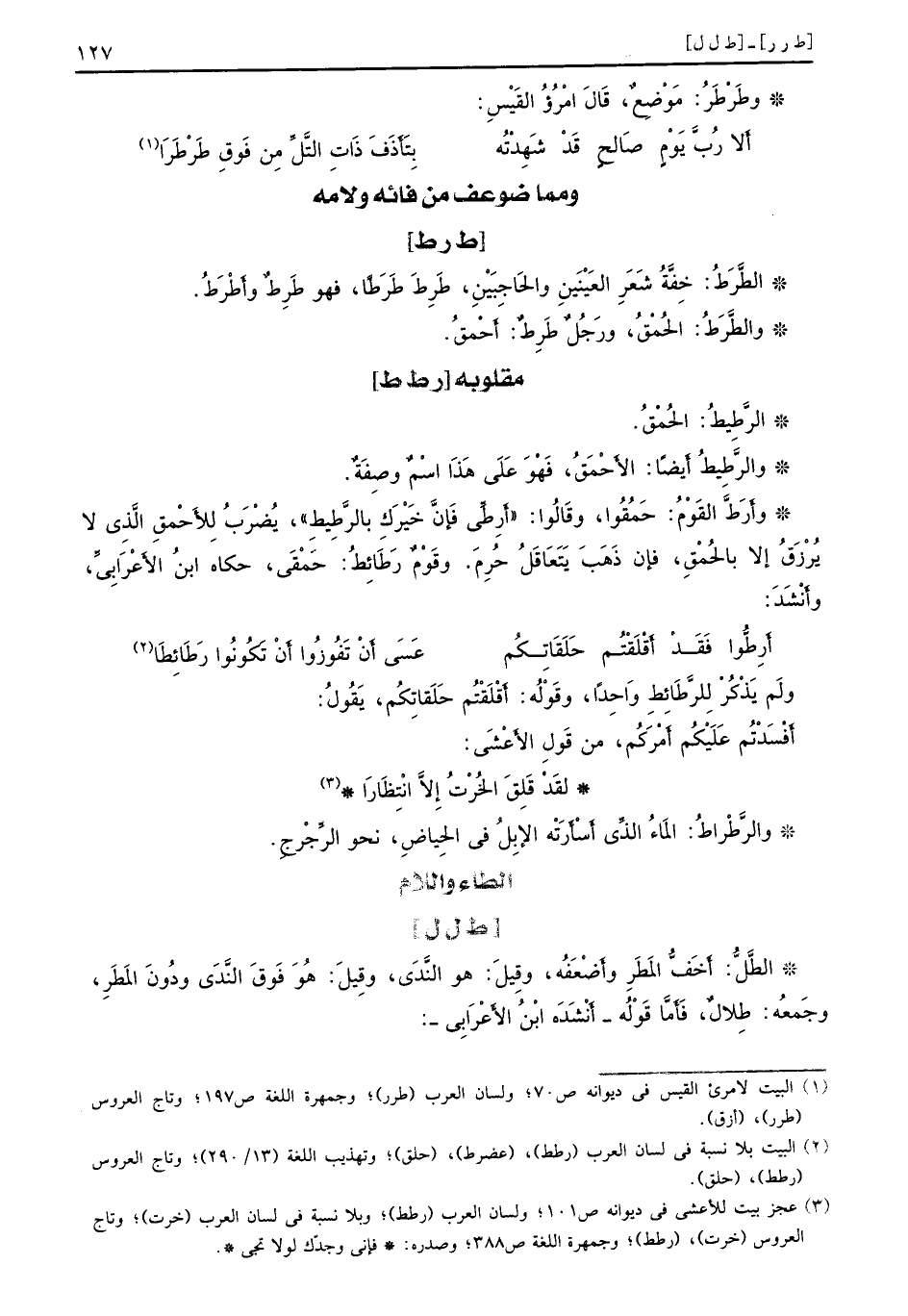 [ط ر ط] الطَّرَطُ: خِفَّةُ شَعَرِ العَيْنَين والحَاجِبَيْنِ، طَرِطَ طَرَطاً، فهو طَرِطٌ وأَطْرَطُ. والطَّرَطُ: الحُمْقُ، ورَجُلٌ طَرِطٌ: أَحْمقُ.