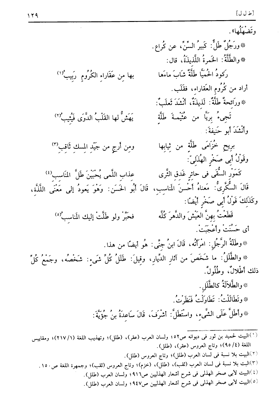 وتَضْهَلُها)) . ورَجُلٌ طَلٌ: كَبيرُ السِّنِّ، عن كُراعِ. والطَّلَّةُ: الخَمرَةُ اللَّذِيذَةُ، قال: