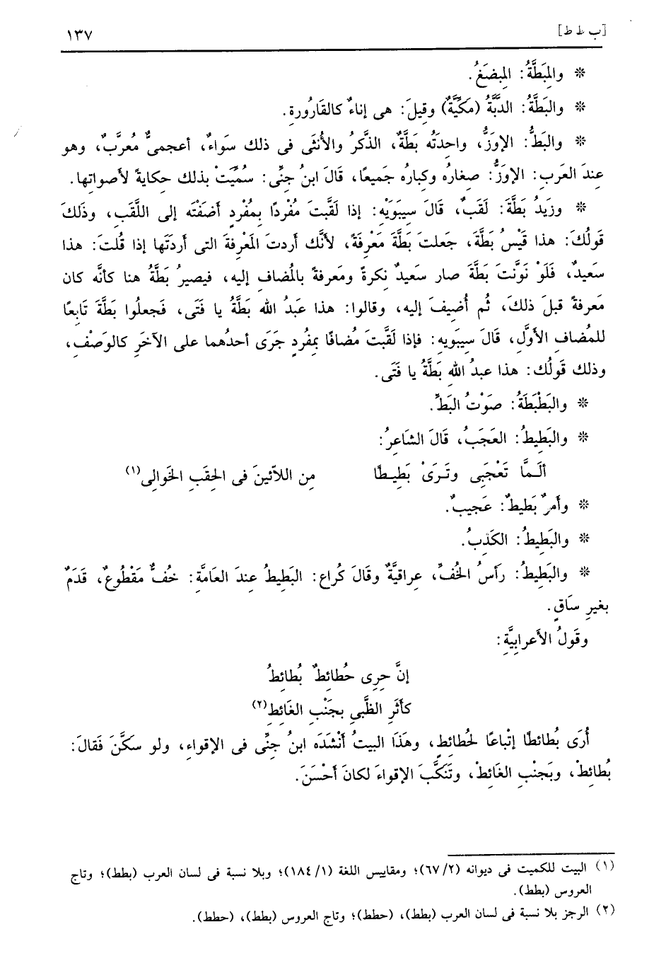 والمِبَطَّةُ: المِبضَغُ. والبَطَّةُ: الدَّبَّةُ (مَكِّيَّةٌ) وقِيلَ: هي إناءٌ كالقَارُورِة. والبَطُّ: الإوَزُّ، واحِدَته بَطَّةٌ، الذَّكُر والأُنثَى في ذلك سَواءٌ، أعجميٌّ مَعرَّبٌ، وهو عِندَ العَربِ: الإوَزُّ: صِغارُه وكِبارُه جَميعاً، قَالَ ابنُ جِنِّي: سُمِّيَتْ بذلك حِكايةً لأَصواتِها. وزَيدُ بَطَّةَ: لَقَبٌ، قَالَ سِيبَوَيْهِ: إذا لًَقَّبتَ مُفْرداً بَمُفْرِدِ أَضَفْتَه إلى اللَّقَبِ، وذَلك قَولُكَ: هذا قَيْسُ بَطَّةَ، جَعلتَ بَطَّةَ مَعْرِفَةً، لأَنَّك أرادتَ المَعْرفَة التي أَردَتَها إذا قُلتَ: هذا سَعيدٌ، فَلَوْ نَوَّنتَ بَطَّةَ صار سَعيدٌ نَكرةً ومَعرفَةً بالُمضافِ إليه، فيصيرُ بَطَّةًُ هنا كأنَّه كان مَعرفَةً قبلَ ذلكَ، ثُم أُضِيفَ إليه، وقالوا: هذا عَبُد الله بَطَّةُ يا فَتَي، فَجعلُوا بَطَّةَ تَابَعاً للمُضافِ الأَوَّلِ، قَالَ سِيبَويِه: فإذا لَقَّبَتَ مُضافاً بمِفُردٍ جَرَى أحدُهما على الآخَرِ كالوَصْفِ، وذلك قَولُك: هذا عبدُ اللهِ بَطَّةُ يا فَتَى. والبَطْبَطَةُ: صَوْتُ البَطِّ. والبَطِيطُ: العَجَبُ، قَالَ الشَاعِرُ: