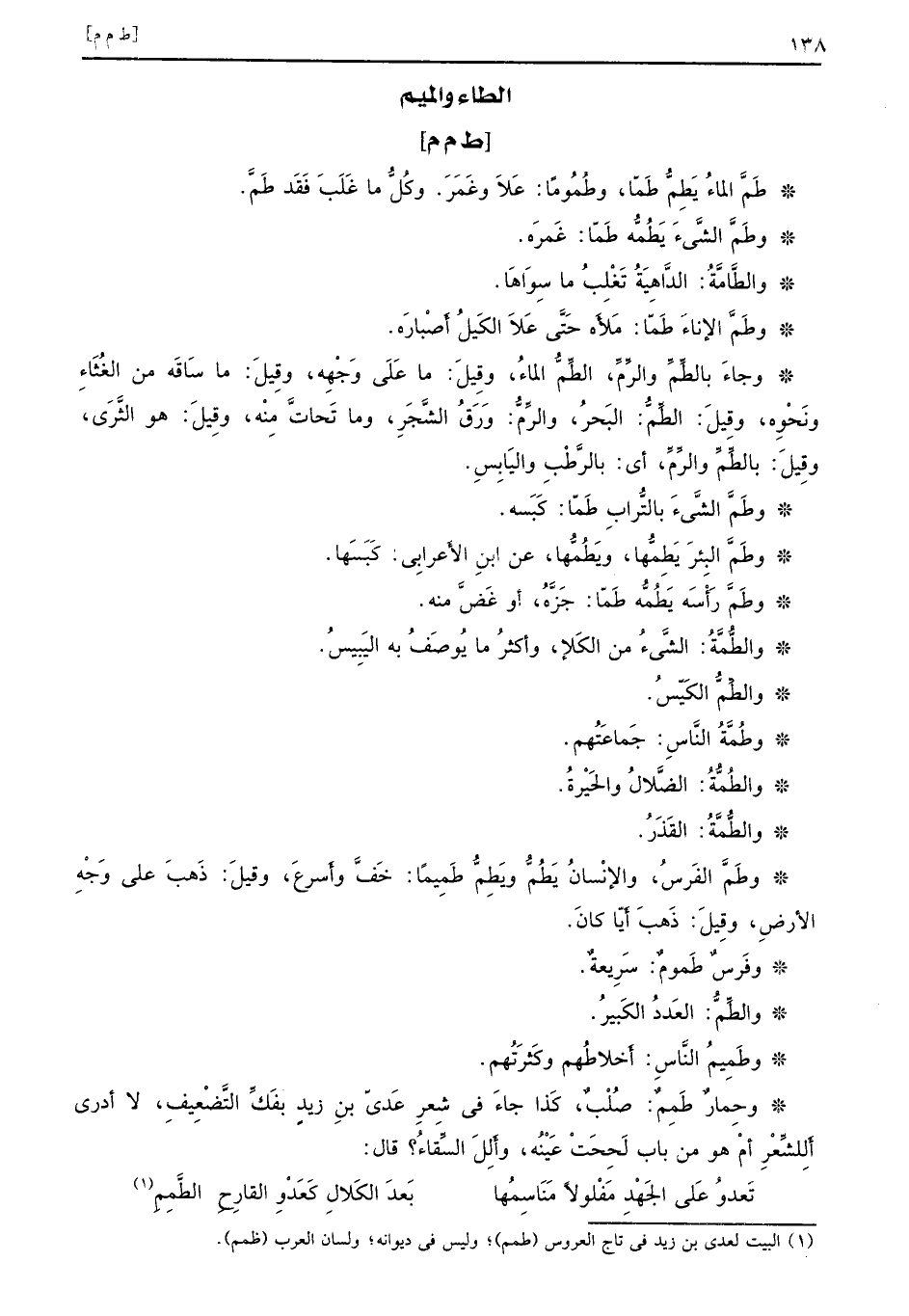 [ط م م] طَمَّ الماءُ يَطِمُّ طَمّا، وطُمُوماً: عَلاَ وغَمَرَ، وكُلُّ ما غَلَبَ فَقَد طَمَّ. وطَمَّ الشَّيءَ يَطُمُّه طَمّا: غَمرَه. والطَّامَّةُ: الدَّاهِيَةُ تَغْلِبُ ما سِوَاهَا. وطَمَّ الإناءَ طَِمّا: مَلأَه حَتَّى عَلاَ الكَيلُ أَصبْارَه. وجاءَ بالطِّمَّ والرِّمَّ، الطِّمُّ الماءُ، وقِيلَ: ما عَلَى وَجْههِ، وقِيلَ: ما سَاقَه من الغُثَاءِ ونَحْوِه، وقِيلَ: الطِّمُّ: البَحُرُ، والرِّمُّ: وَرَقُ الشَّجَرِ، وما تَحاتَّ مِنْه، وقِيلَ: هو الثَّرَى، وقِيلَ: بالطِّمِّ والرَّمَّ، أي: بالرَّطْبِ واليَابِسِ. وطَمَّ الشَّيءَ بالتُّرابِ طَمّا: كَبَسه. وطَمَّ البِئرَ يَطِمُّها، ويَطُمُّها، عن ابنِ الأَعرابِي: كَبَسَها. وطَمَّ رَأْسَه يَطُمُّه طَمّا: جَزمَّهُ، أو غَضَّ منه. والطُّمَّةُ: الشَّيءُ من الكَلاْ، وأكثُر ما يُوصَفُ به اليَبِيسُ. والطِّمُّ الكَيّسُ. وطُمَّةُ النَّاسِ: جَماعِتُهم. والطّمُّةُ: الضَّلالُ والحَيْرةُ. والطُّمَّةُ: القَذَرُ. وطَمَّ الفَرسُ، والإنْسانُ يَطُمُّ ويَطُمُّ طَمِيماً: خَفَّ وأَسرعَ، وقيلَ: ذَهَب على وَجْهِ الأرضِ، وقِيلَ: ذَهبَ أَيّا كانَ. وفَرسٌ طَمومٌ: سَرِيعةٌ. والطِّمُّ: العَددُ الكَبيرُ. وطَمِيمُ النَّاسِ: أَخلاطُهم وكَثرَتُهم. وحِمارٌ طَمِمٌ: صُلْبٌ، كَذا جاءَ في شِعر عَديّ بن زيدٍ بفَكِّ التَّضْعيفِ، لا أدري أَلِلشِّعْرِ أمْ هو من باب لِحِحَتْ عَيْنُه، وأَلِلَ السِّقاءُ؟ قال: