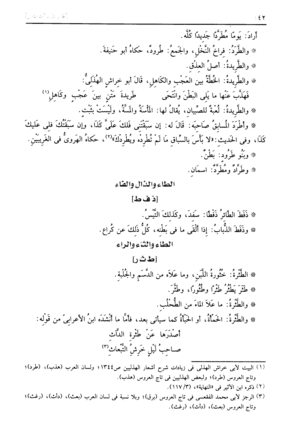 أرادَ: يَوماً مُطَرَّداً جَديداً كُلَّه. والطَّرَدُ: فرِاخُ النَّخْلِ، والجَمعُ: طُرودٌ، حَكاهُ أبو حَنيفةَ. والطَّرِيدةُ: أصلُ العِذْقِ. والطَّرِيدةُ: الخُطَّةُ بين العَجْبِ والكَاهِلِ، قَالَ أبو خِراشٍ الهُذَليُّ: