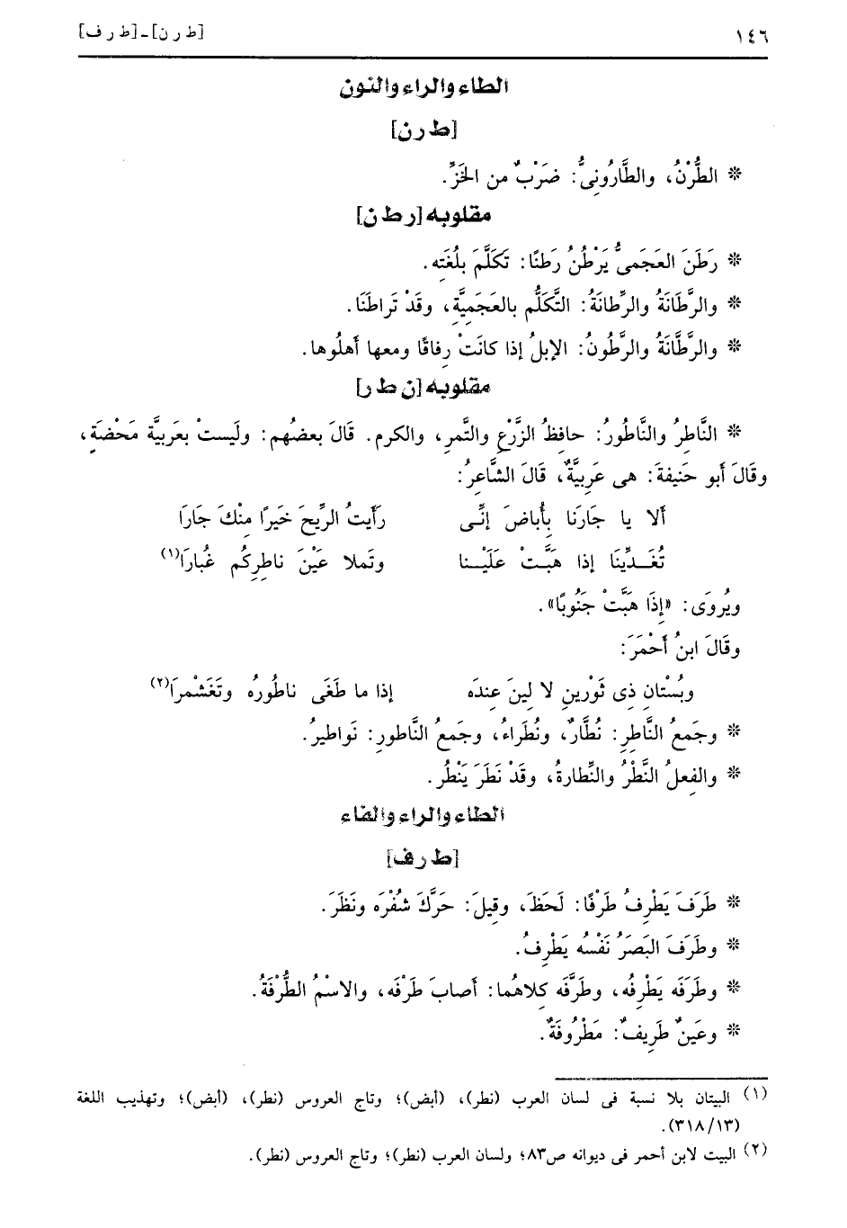 [ن ط ر] النَّاطِرُ والنَّاطُورُ: حافِظُ الزَّرْعِ والتَّمِر، والكرم. قَالَ بعضُهم: ولَستْ بعَربيَّة مَحْضَةٍ، وقَالَ أَبو حَنيفةَ: هي عَرِبيَّةٌ، قَالَ الشَّاعُرِ: