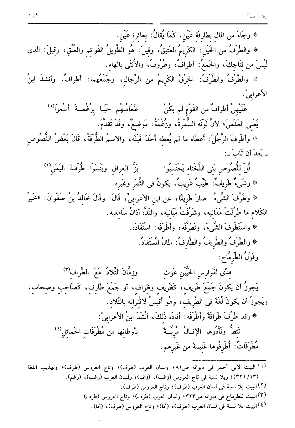 وشَيءٌ طَرِيفٌ: طَيِّبٌ غَرِيبٌ، يكونُ في الثَّمَرِ وغَيرِه. وطَرُفَ الشَّيءُ: صارَ طَريِفاً، عن ابنِ الأَعرابِيٍّ، قَالَ: وقَالَ خَالِدُ بنُ صَفُوانَ: ((خيرُ الكَلامِ ما طَرْفَتْ مَعَانِيه، وشَرْفَتْ مَبَانِيه، والتَذَّه آذانُ سَامِعيه. واسْتَطْرفَ الشَّيءَ، وتَطَرَّفَه، وأَطْرَفَه: اسْتفَادَه. والطِّرَفُ والطَّرِيفُ والطَّارِفُ: المالُ المُسْتفادُ. وقَوْلُ الطِّرِمَّاح: