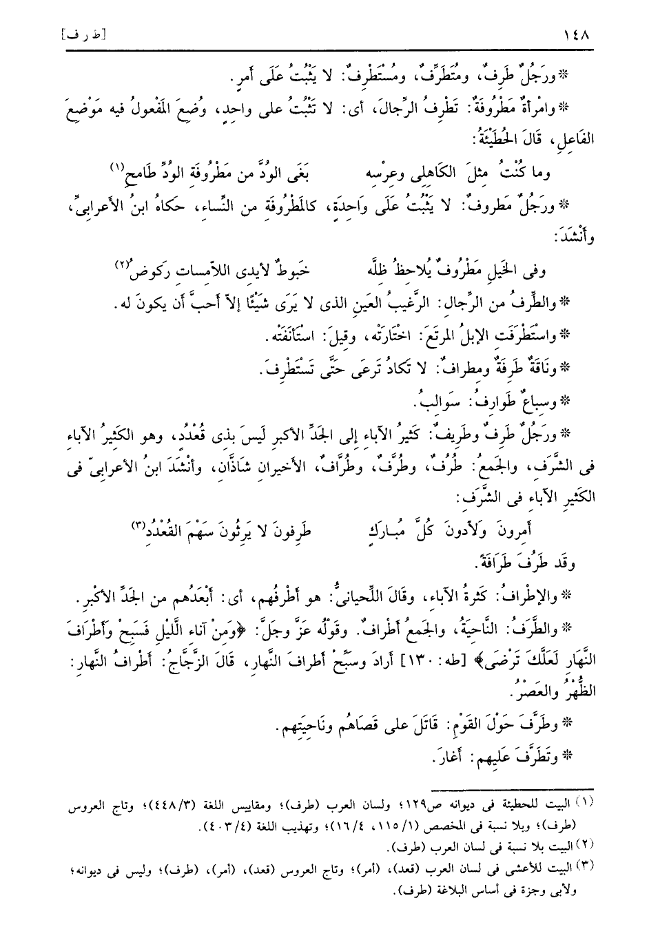 ورَجُلٌ طَرِفٌ، ومُتَطَرِّفٌ، ومُسْتَطْرِفٌ: لا يَثْبُتُ عَلَى أَمرٍ. وامْرأةٌ مَطْرُوفَةٌ: تَطْرِفُ الرِّجالَ، أي: لا تَثْبُتُ على واحِدٍ، وَضِعَ المَفْعولُ فيه مَوْضِعَ الفَاعِلِ، قَالَ الحُطَيْئَةُ: